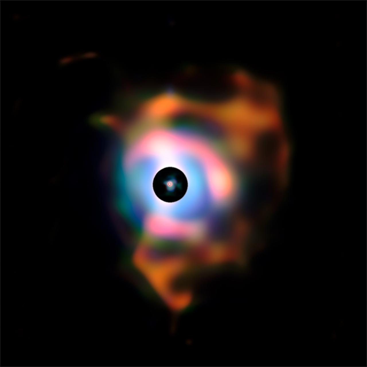 Since the nebula isn’t as bright as Betelgeuse, astronomers have to block some of the star’s light to be able to photograph it. This is why there is a black disk around the star – this is where astronomers blocked light from the bright star from entering the telescope so that they could photograph the nebula. The photo of the bright star was taken at a different time and astronomers then put the two pictures together.