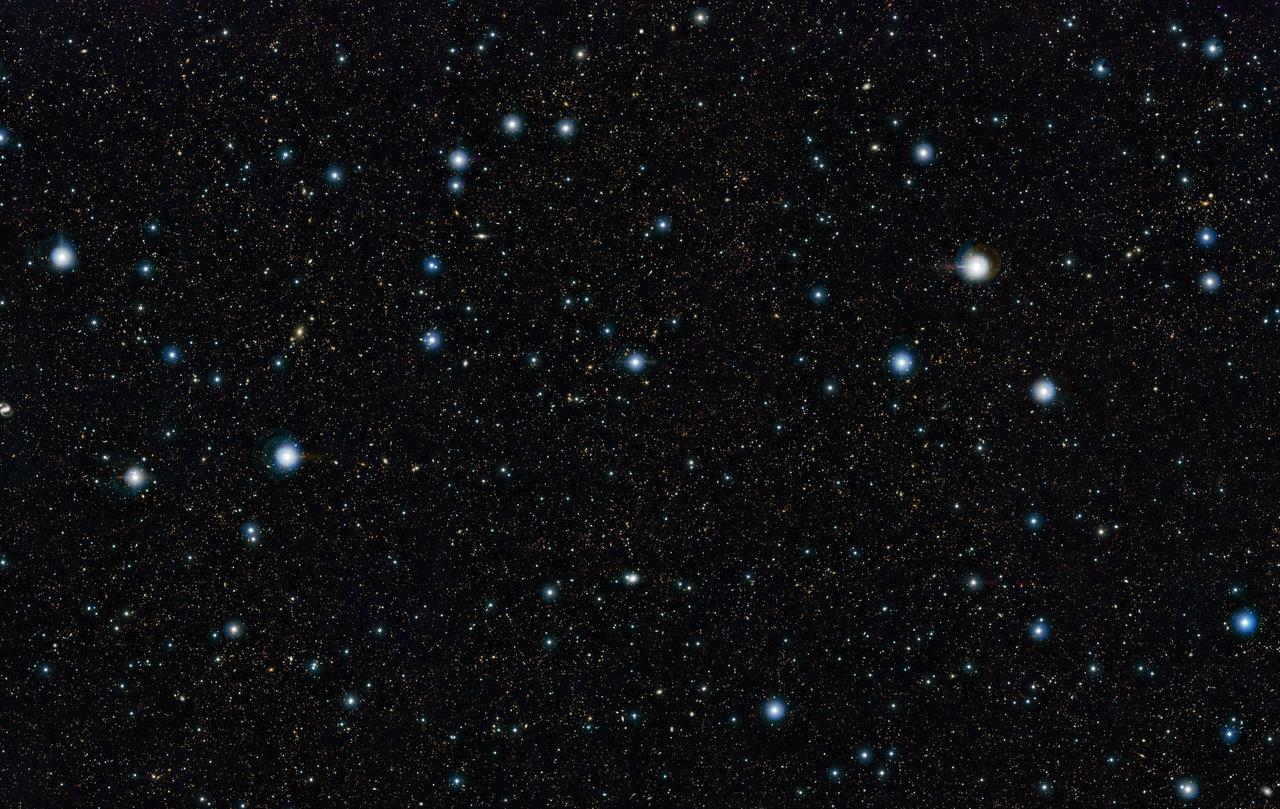 At first glance this new space photo doesn’t look very special, just a few bright stars and a sprinkling of fainter ones. But in fact almost all of those fainter objects are not stars in our Galaxy, the Milky Way. They are actually very remote galaxies, each containing billions of stars!