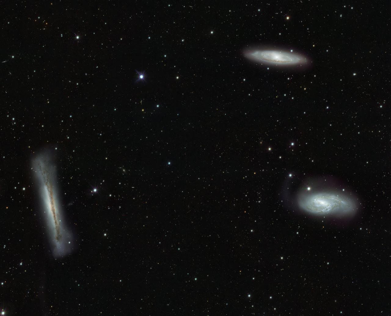 Grawitacja nie tylko trzyma ludzi na Ziemi, utrzymuje ona również planety w naszym Układzie Słonecznym, wiążąc je ze Słońcem. Utrzymuje ona razem gaz, pył i miliony gwiazd w naszej Galaktyce (Drodze Mlecznej). Nawet galaktyki nie wędrują w przestrzeni kosmicznej samotnie, istnieją gromady związanych ze sobą galaktyk. Droga Mleczna jest jedną z 40 galaktyk w naszej gromadzie! Tryplet Lwa jest znacznie mniejszym systemem, składa się jedynie z trzech galaktyk. Zdjęcie całej gromady możesz obejrzeć tutaj.