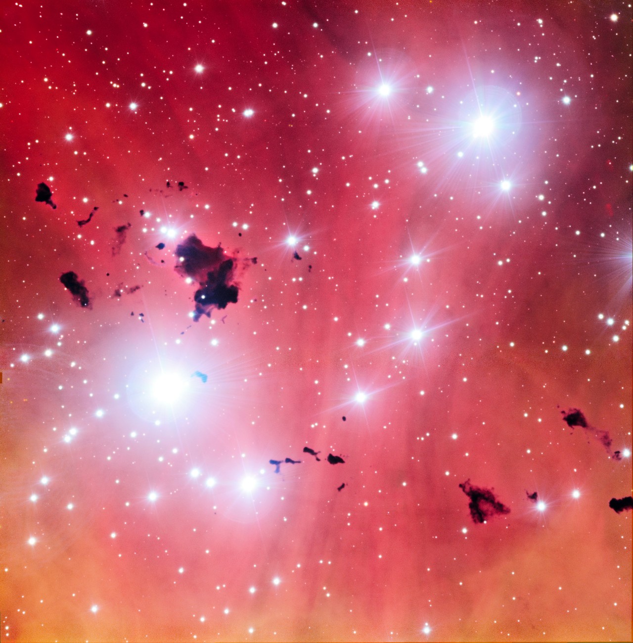Þetta er augljóslega ekki veisla í geimnum, þótt hún hljómi svo sem ágætlega. Á myndinni sést glæsilegt ský úr gasi og ryki sem stjörnufræðingar kalla stjörnumyndunarsvæði. Djúpt innan í þessu fallega bleika skýi fæðast nýjar stjörnur. Því miður er rykið svo þykkt að það gleypir ljósið frá þessum nýfæddu stjörnum svo Very Large Telescope getur ekki komið auga á þær.