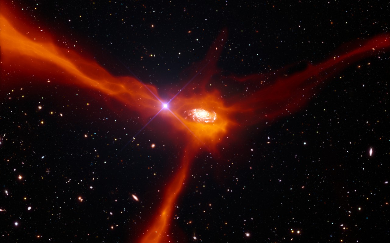 之所以能看到这个精彩场面,是因为在我们的视线里,远方超级亮的星系中心完美的排在了“吃货”星系的身后。光线只有穿透所有包裹着这个贪婪星系的宇宙尘埃才能达到我们的望远镜,为我们还原一个真实的场面,以及清楚的细节。