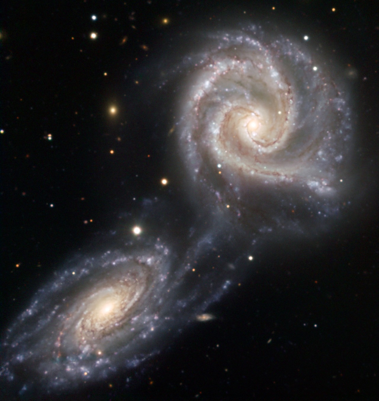 Ако излезеш навън през ясна нощ, далеч от градските светлини, ще видиш хиляди блещукащи звезди. Всяка от тях е част от галакатиката, в която живеем, наречена Млечен път. Отвъд Млечния път има милиарди други галактики чак до края на Вселената. Всяка от тях е сбор от милиони звезди, космически прах и газ, които се държат заедно с помощта на гравитацията. Галактиките са с най-различни форми и размери; много от тях са плоски спирални галактики като Млечния път. Те са изключително тънки и често имат спирални ръкави, увити около ядрото. Спиралните галактики също така се въртят много бързо, като огромни пумпали. Големият брой спирални галактики е загадка за астрономите. Тези тънки дискове са чупливи и лесни за унищожаване от бурни събития, като сблъсъци с други галактики. През живота си почти всяка галактика ще стане жертва на космически сблъсък. Това може да означава, че две галактики наистина ще се сблъскат една с друга и ще се превърнат в безформена купчина от новозараждащи се звезди. Или може да означава, че двете галактики ще минат близо една до друга и ще си повлияят само чрез гравитационното си притегляне. Много години астрономите вярваха, че когато две спирални галактики с приблизително еднакъв размер се сблъскат, те ще се превърнат в един особен тип галактика, наречена елиптична галактика, която има формата на сплескана футболна топка. Но ако две спирални галактики правят една елиптична, то защо все още има толкова много спирални галактики във Вселената? Този въпрос не оставя астрономите на мира вече десетилетия!