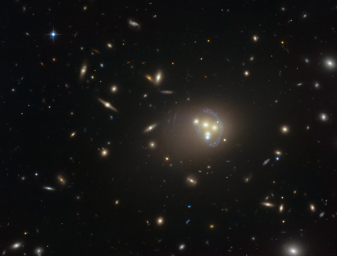 위의 사진은 어마어마한 우주충돌을 보여줍니다. 거대한 은하 네 개가 동시에 충돌한 것입니다! 천문학자들은 이 격렬한 사건에서 한 은하를 휘감고 있는 암흑물질이 다른 것보다 뒤쳐져 있는 것을 알게 되었습니다.