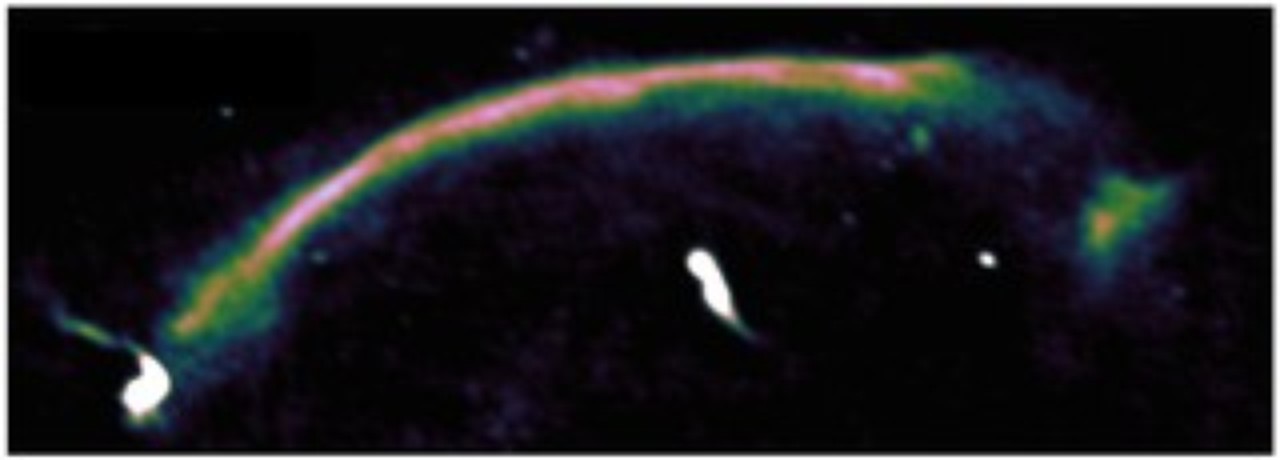 Over billions of years, galaxy clusters merge with neighbouring clusters, like growing cities absorbing nearby towns. When this happens there is a huge release of energy as the clusters crash together. This colourful space photograph shows the shock wave created by two merging clusters known as the Sausage Cluster.