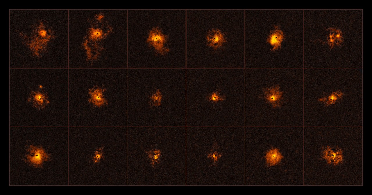 I Halloween-ugen er gaderne fyldt med forskellige skræmmende karakterer lige fra spøgelser til blodsugende vampyrer. Vi ved alle, at det bare er vores venner og naboer klædt ud i kostumer og falsk blod. Monstre eksisterer ikke i virkeligheden… eller gør de? Nok gemmer de sig ikke i dit skab eller under din seng, men der eksisterer monstre i rummet. Sorte huller er universets monstre. De lurer i mørket og venter på, at intetanende planeter og stjerner kommer for tæt på. Når de gør det, bliver de det sorte huls middag. Det lyder ret sejt, og det kan måske overraske at høre, at vi snakker om sorte huller i denne uge, eftersom mange sorte huller for nyligt er blevet set med en skinnende halo (glorie) omkring sig. Haloer er faktisk meget normale i rummet. Alle galakser er omkranset af en såkaldt halo lavet af gamle stjerner og et mystisk usynligt materiale, kaldet mørkt stof. Det der gør de nyligt opdagede haloer interessante er, at de skinner. Forskere opdagede dem, mens de studerede en særlig gruppe af galakser kaldet kvasarer. Kvasarer tilhører en galaksetype, som har et aktivt, ‘spisende’ sort hul i galaksens midte. Mens sorte huller spiser, bliver store stråler af energi dannet. Disse stærke stråler skyder ud fra det sorte hul og får den usynlige halo til at skinne. Når det sker, kan vores teleskoper se gassen, som en glødende halo rundt om galaksen. Før i tiden kunne vi se, at 1 ud af 10 kvasarer havde en halo. Nu, efter at have kigget på himlen med et kraftigere teleskop, opdagede vi, at alle kvasarer, vi kiggede på, havde en halo! Billedet ovenfor er en mosaik af 18 af de observerede kvasarer - alle med en glødende halo. Det næste spørgsmål vi gerne vil besvare lyder: har alle kvasarer en halo, eller kiggede vi bare på en særlig højtidelig gruppe?