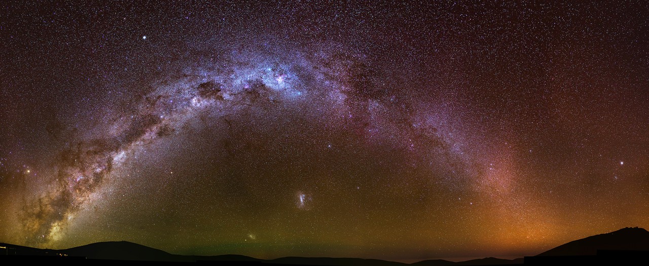 The picture above shows the arch of the Milky Way galaxy stretching across the night. Underneath you can see the two dwarf galaxies; the brighter blob of the Large Magellanic Cloud and the dimmer Small Magellanic Cloud below.