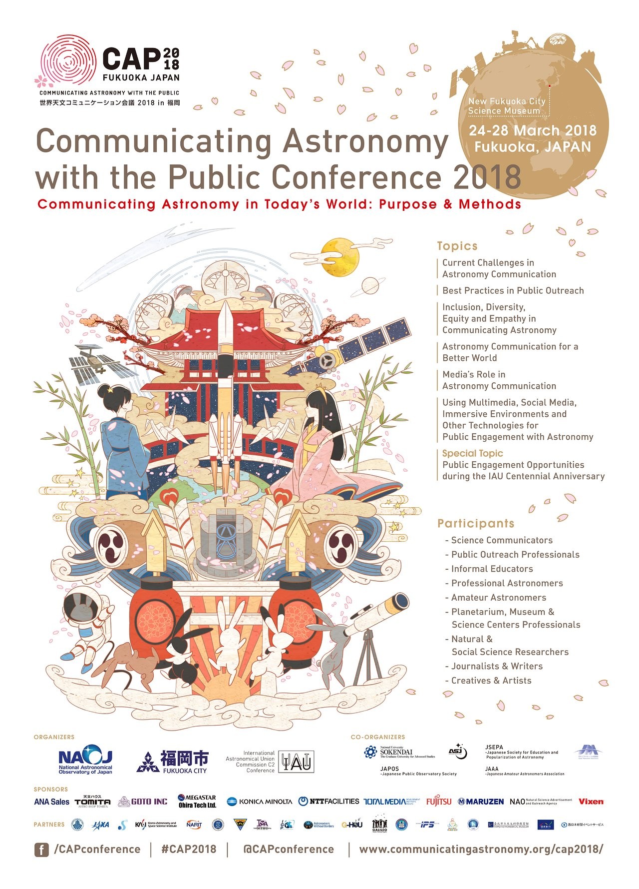 This CAP conference was organised by three organizing committees: the International Astronomical Union (IAU), Fukuoka City, and the National Astronomical Observatory of Japan (NAOJ). These committees collaborated with various organisations from Japan, a Scientific Organising Committee, the National Organising Committee and Local Organising Committee, supported by international collaborators and sponsors.