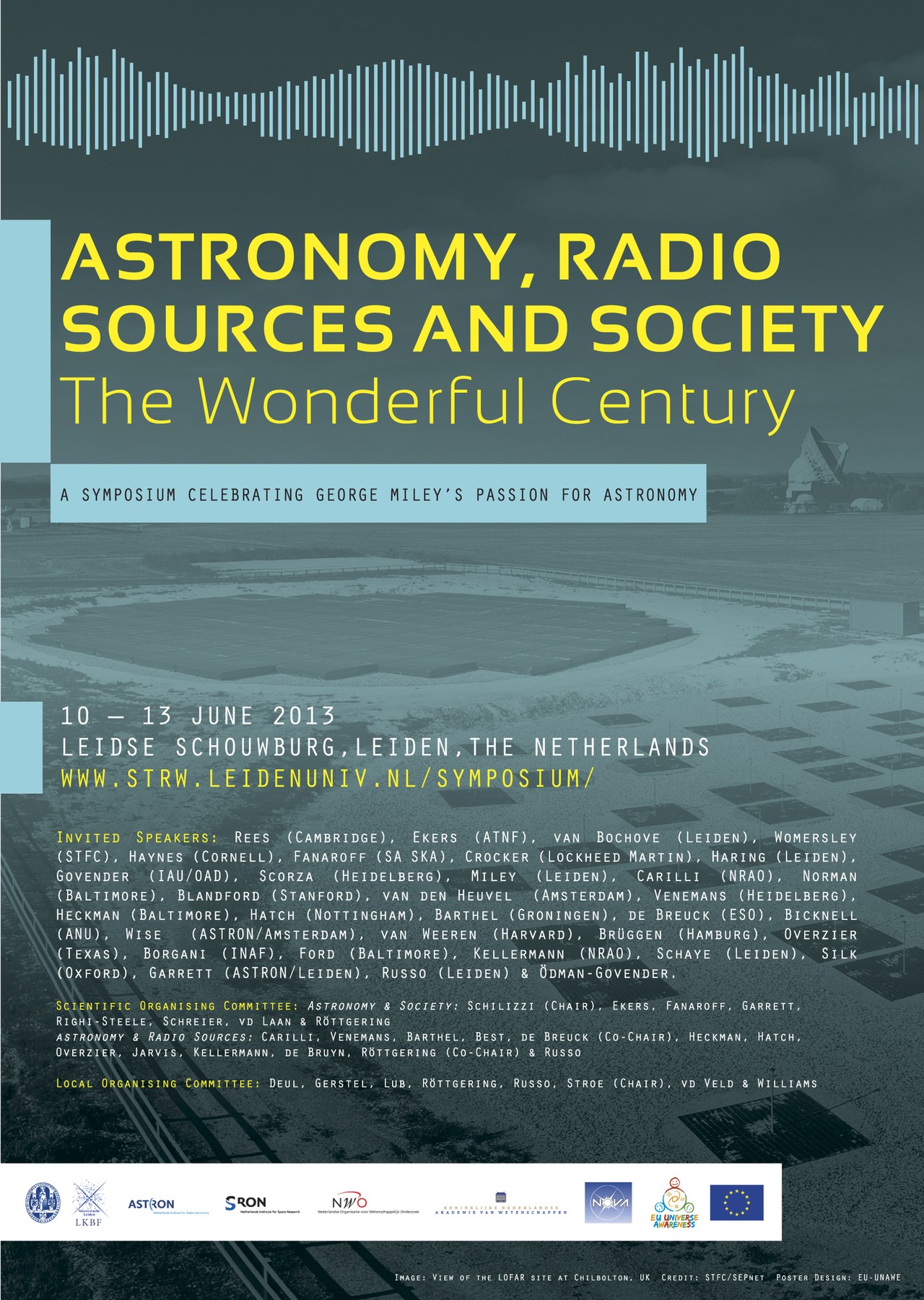 Leiden Observatory is hosting the Astronomy, Radio Sources and Society, The Wonderful Century symposium on 10-13 June 2013. The event will bring together some of today's top research astronomers, science, policy makers, science communicators and educators and members of the media to discuss several topics on astronomy, radio sources and society and celebrate Professor George Miley’s achievements in the different domains of astronomy.