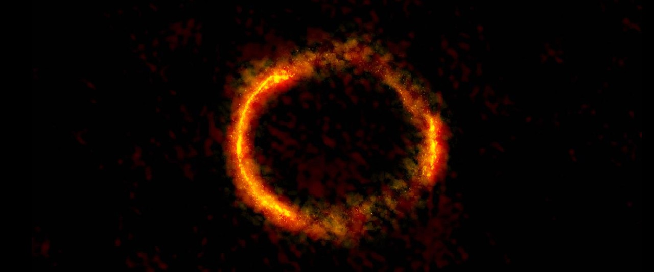 Last year, using the ALMA telescopes, astronomers made this strange photo of a very distant galaxy. The distant galaxy in this image is not ring-shaped at all, it has been distorted by a cosmic lens which has bent the light of the distant galaxy into a ring. This is similar to the way your reflection is distorted by the curved shape of a spoon.