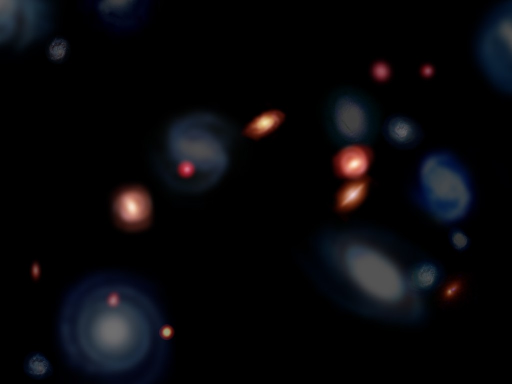 Using the ALMA telescope astronomers have just discovered a group of never-before-seen "normal galaxies" which were previously hidden by a thick dust cloud. This artist's impression shows the new galaxies are shown in red, the blue-coloured galaxies were imaged by a visible light telescope.