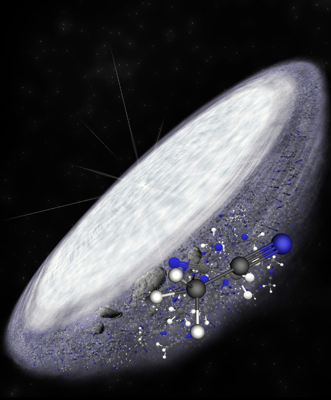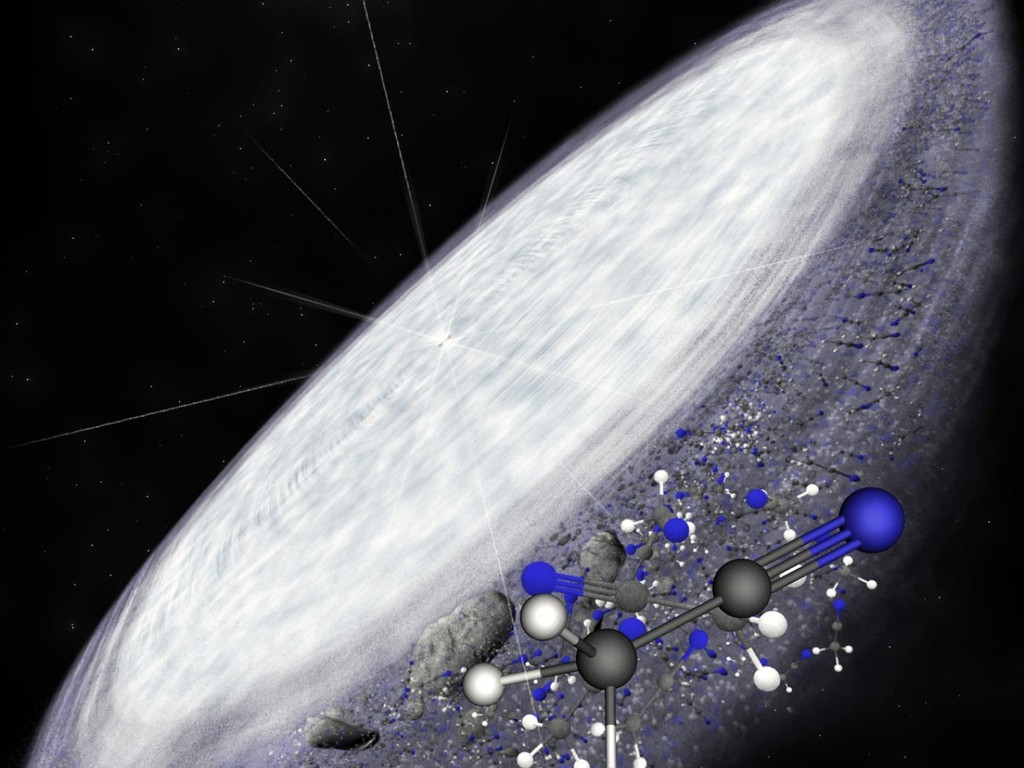 This weird-looking picture is an artists creation showing a number of molecules (Moll-eh-kyools), inside a disc around a young star. Molecules are the building blocks of life, like lego pieces that make up a larger structure, such a rocket or a ship. This disc will one day form into several stars and with the help of these organic molecules, they could host alien life!