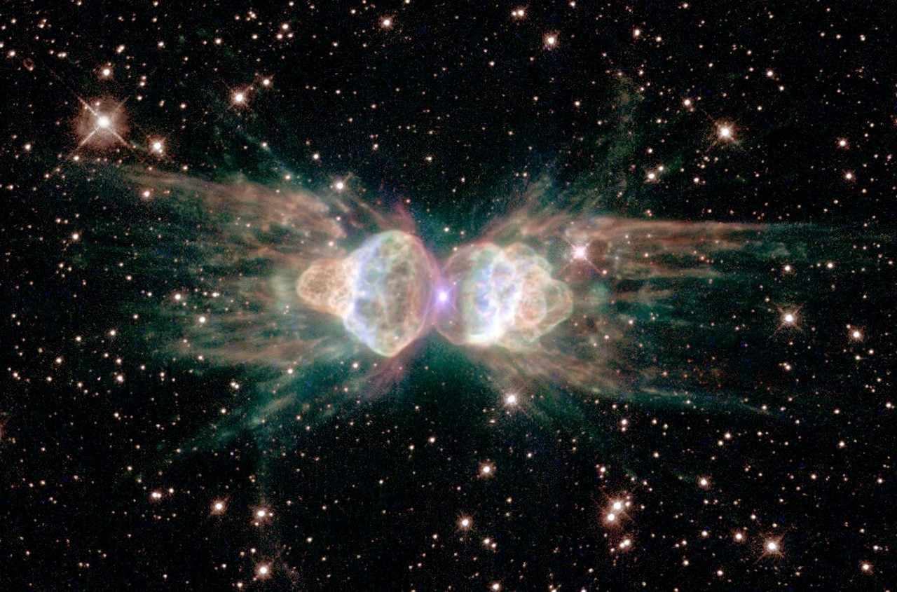 This space photograph shows the Ant Nebula. According to some it resembles the head and body of a garden ant. In reality, this cloud of cosmic gas is the result of a dying Sun-like star and complex interactions of material at its heart.