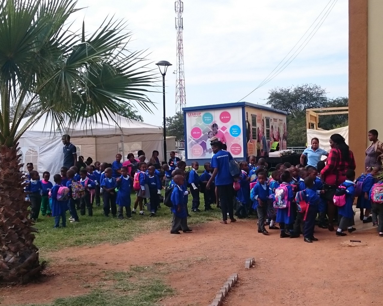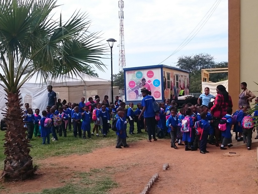Young BIUST students waiting in line to enter the exhibition area.