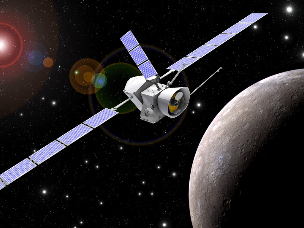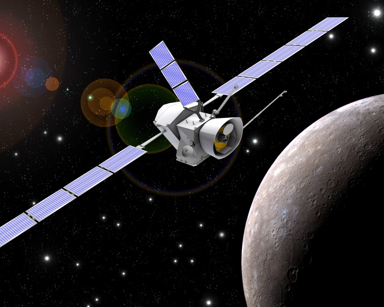 BepiColombo is a spacecraft that will study the Mercury, the closest planet to the Sun. This picture was created by an artist to show the spacecraft in orbit around the planet, where it will arrive in 2025. This is an especially challenging mission as Mercury is very close to the Sun, making it one of the hottest regions of our Solar System.