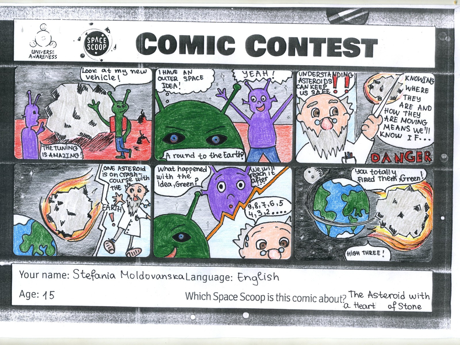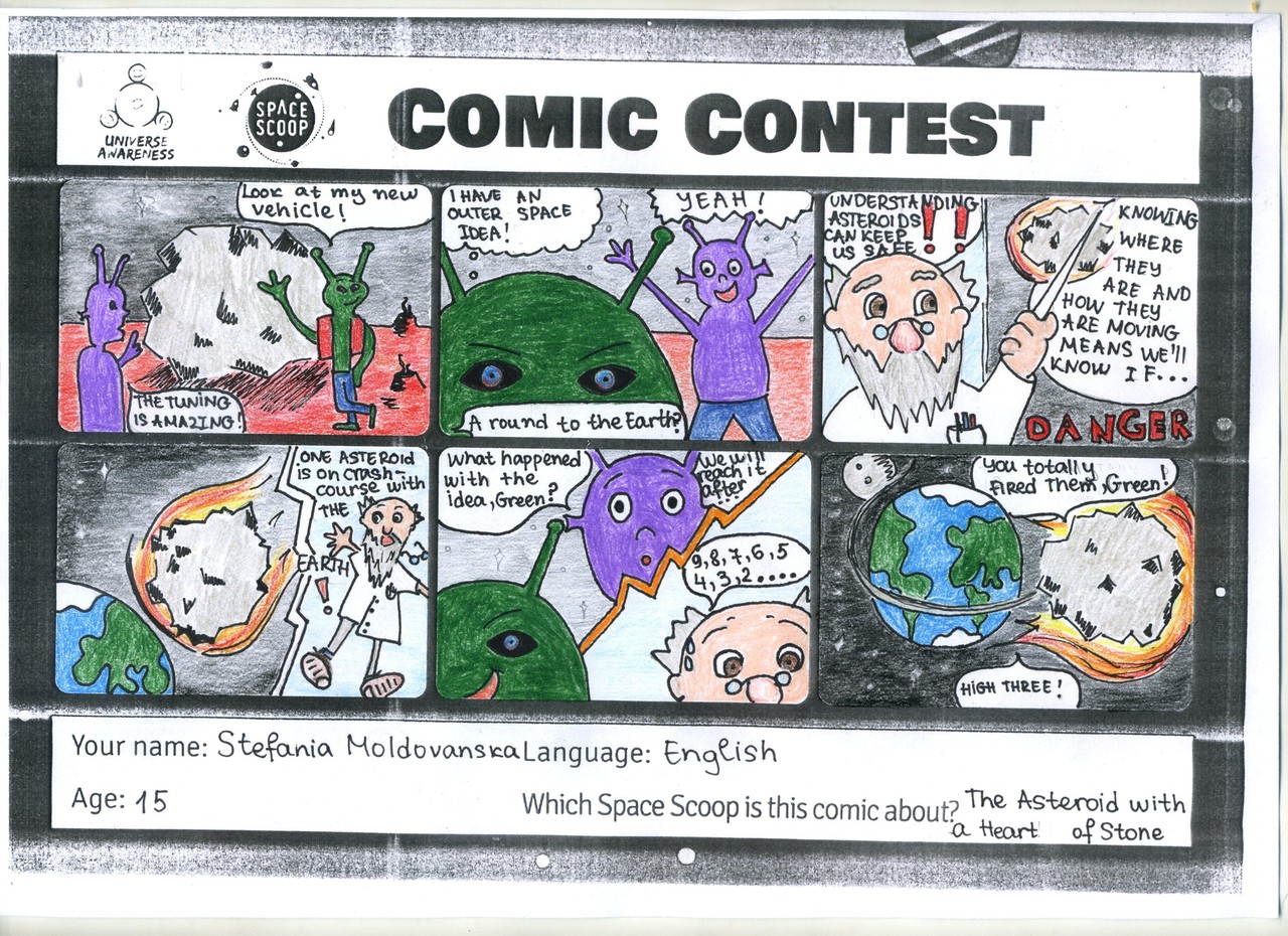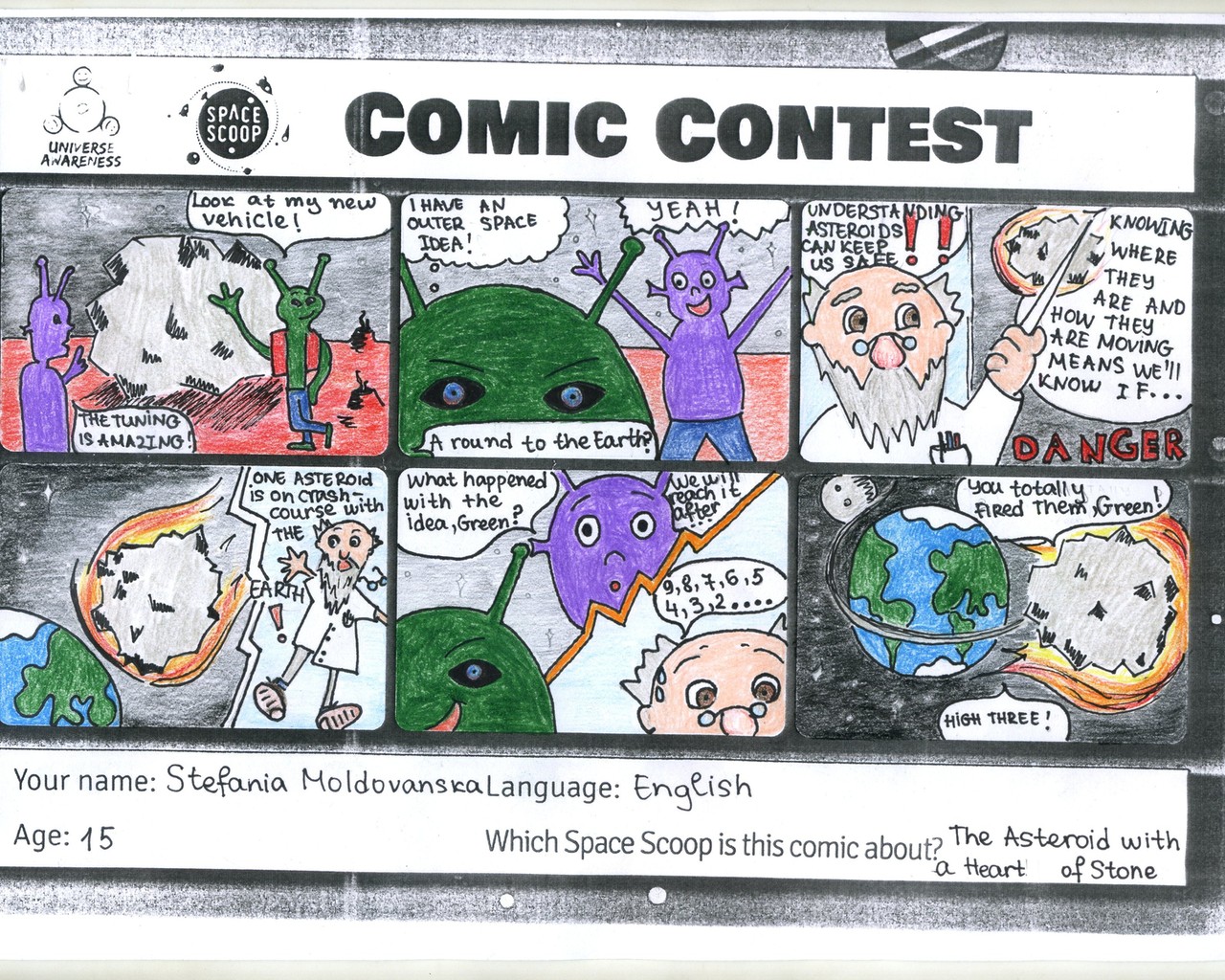 Stefania Moldovanska (Bulgaria) is a 15 year old student from Bulgaria, winner of the Space Scoop International Comic Contest 12-15 years category. She has chosen to depict the Space Scoop, “An Asteroid with a Heart of Stone”. Her comic is fast-paced, highly entertaining and humorous, with an educational element that describes the importance of asteroid tracking. The comic is the ideal length, with fabulous hand-drawn style that is bold and filled with personality. Stefania wins a Firstscope telescope.