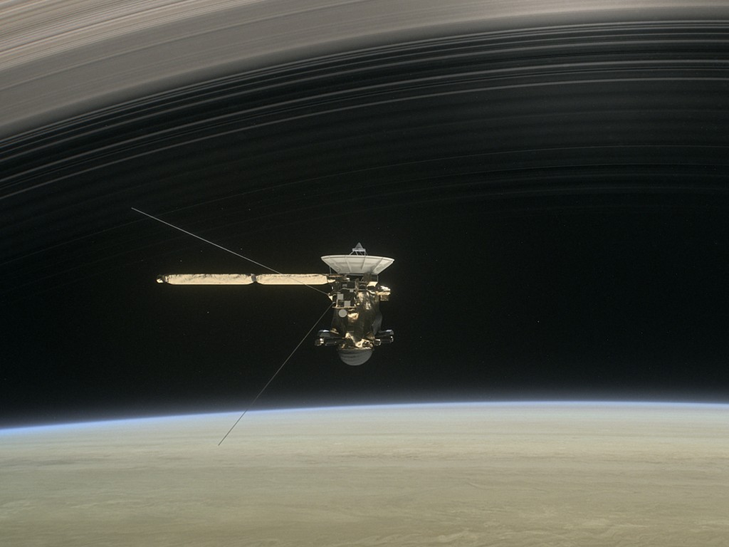 Artists created this picture to show the Cassini spacecraft diving between Saturn and its rings as part of the mission's Grand Finale.
