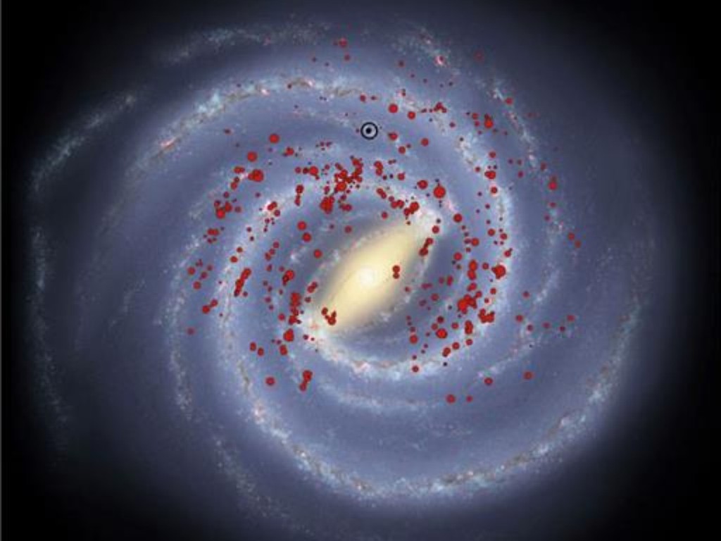This artist’s impression shows our Galaxy, the Milky Way, as the spiral shape in the background. The massive stars referred to in the new study are indicated by red circles. The position of the Solar System is marked by a black dot and circle at the top centre.