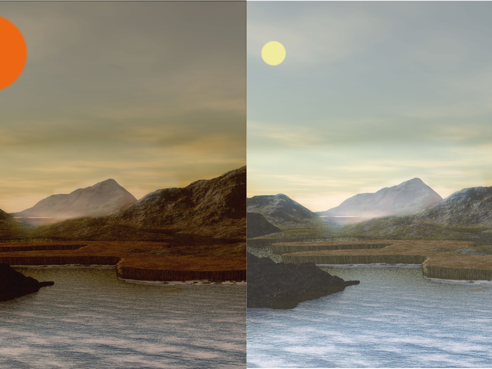 The image on the left shows a planet around a star smaller and cooler than the Sun. The starlight on this world would be different than on our home, however underwater conditions would be the same! This is because only only blue-green light can travel through meters of water.