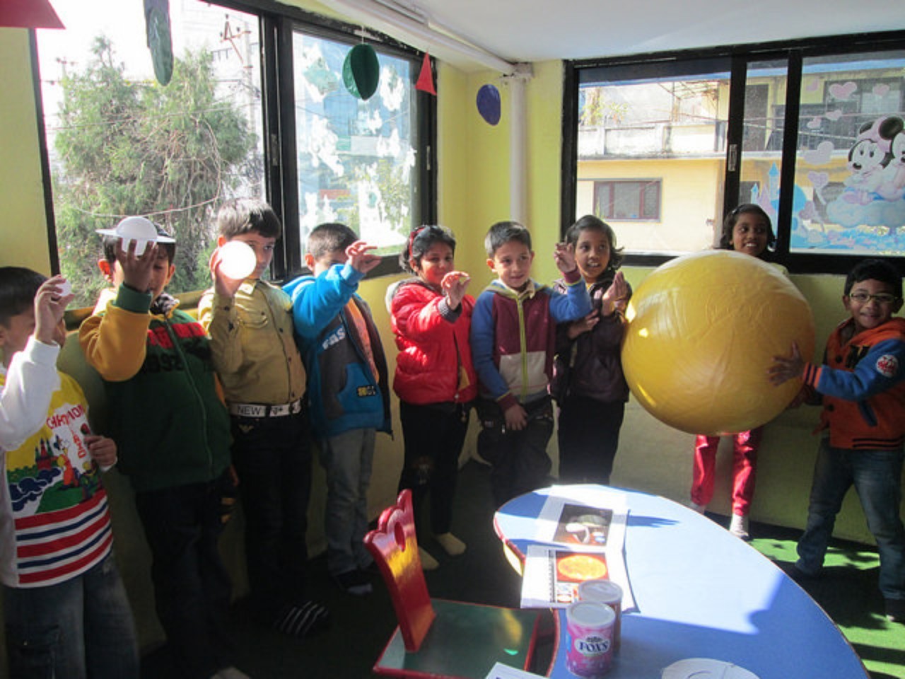 Children in Nepal demonstrate Universe in a Box’s to-scale Solar System model. December 2014