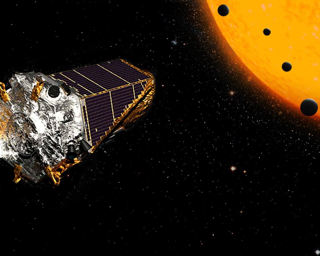 An artist created this picture to shows the Kepler Space Telescope at work. This telescope has discovered thousands of distant worlds.