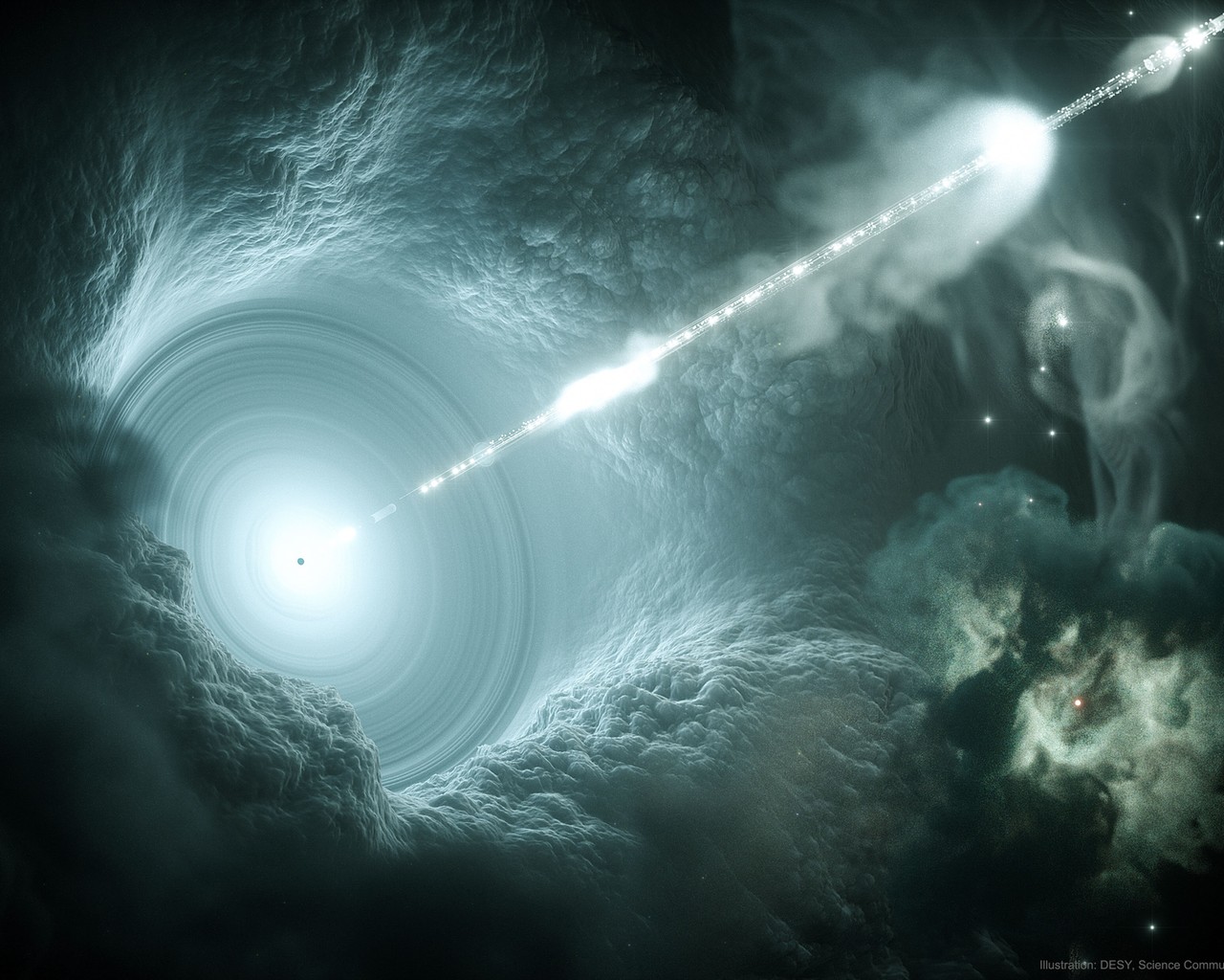 An artist has drawn this picture to give us an up-close view of the supermassive black hole swallowing material at the centre of a galaxy. As it tears material to pieces, the black hole is shooting high-energy jets towards Earth. We call this type of galaxy a Blazar and we've just found out they are shooting our super energetic particles called "neutrinos".