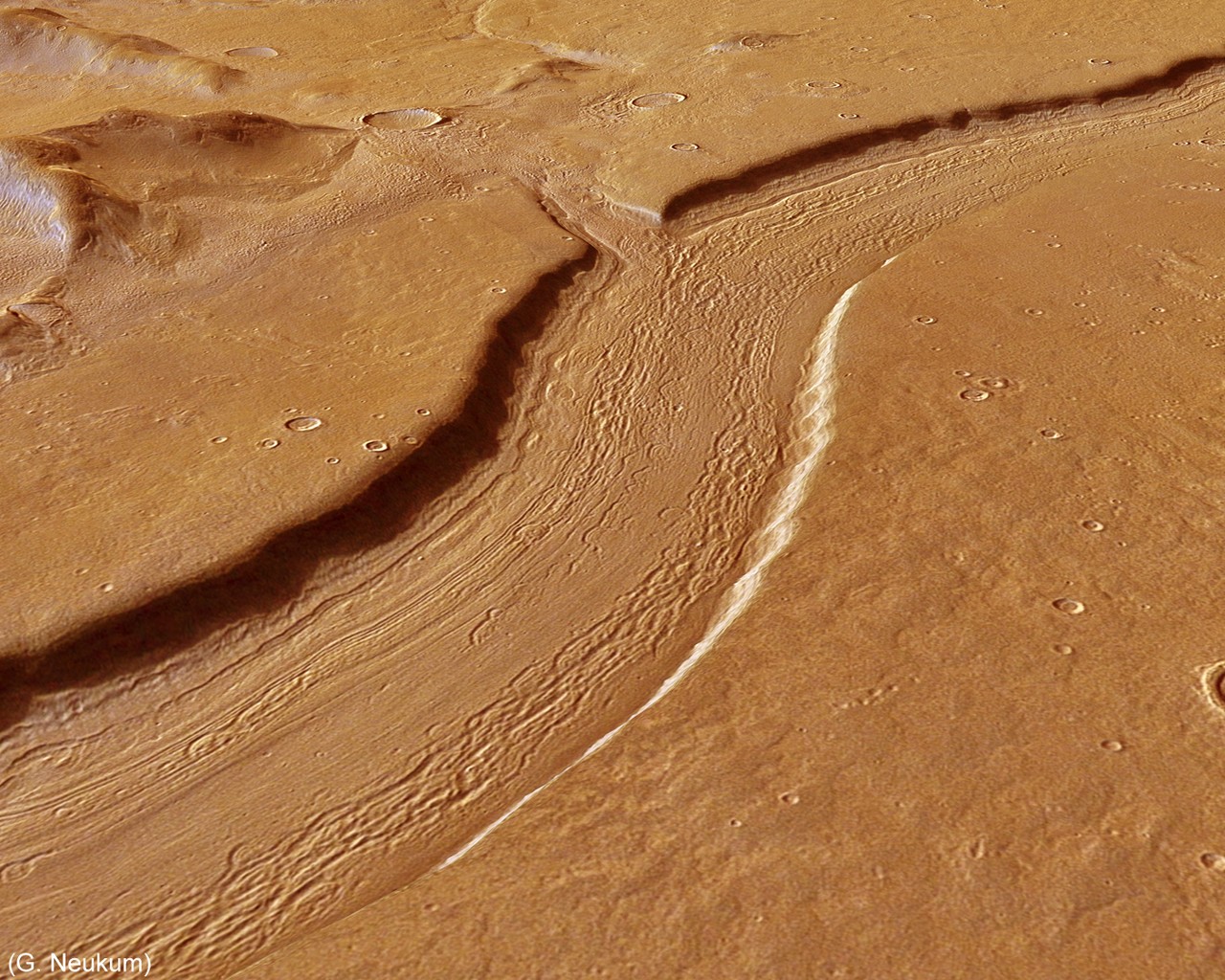 These amazing pictures were taken by the Mars Express spacecraft, which is orbiting around Mars. The first shows a river-like ditch winding across the surface of the planet. This is believed to have been carved by deep, flowing water in the distant Martian past, billions of years before humans even existed!