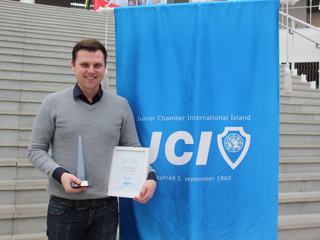 UNAWE coordinator Sævar Helgi Bragason proudly shows his award for Most Outstanding Young Person in Iceland to the public and press.