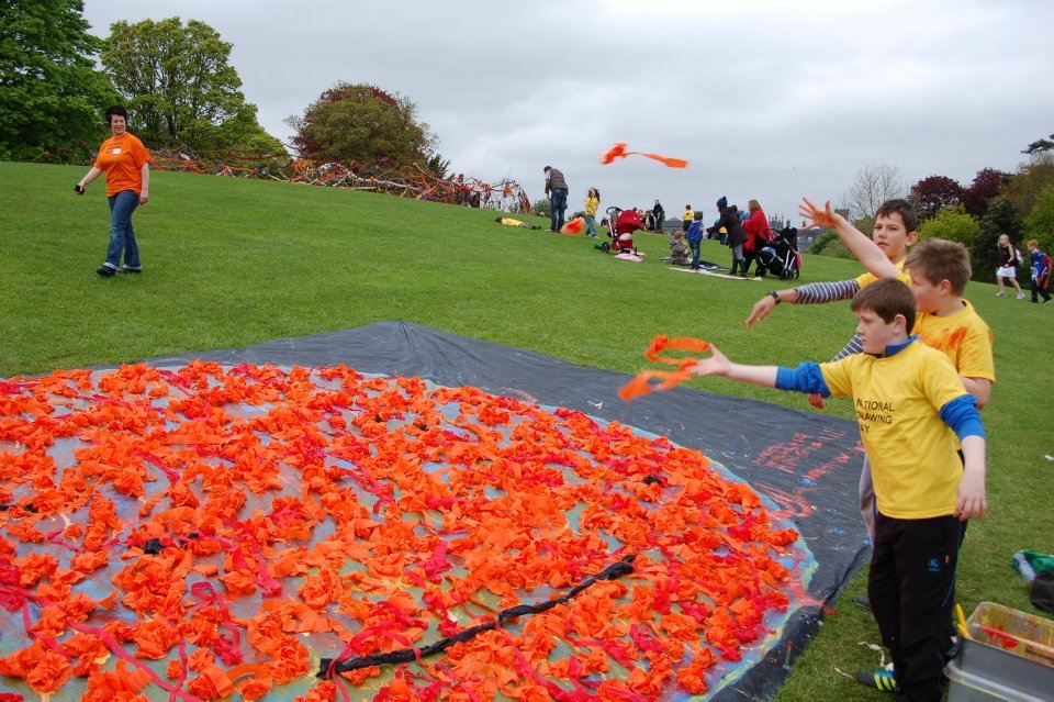 Front-to-back: Matthew Shortall, Daragh Lynch and Max Gronowski throw paint-covered crepe paper to create a textured picture of our nearest star in the Action Sun workshop.