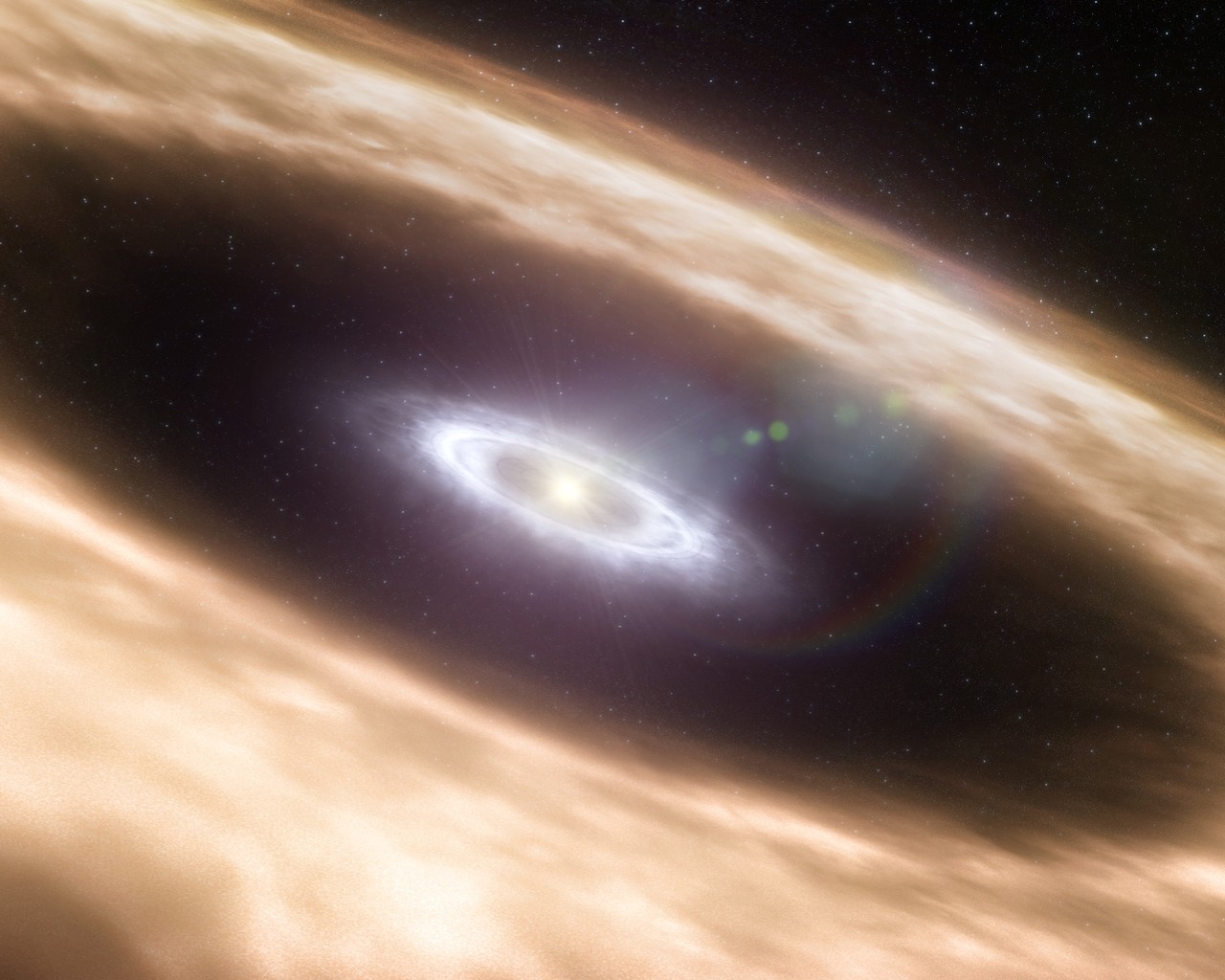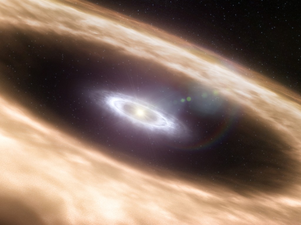 An artist created this picture to show us what a solar system looks like as it forms. The star is at the very centre and the rocky material in the ring may one day form into planets!