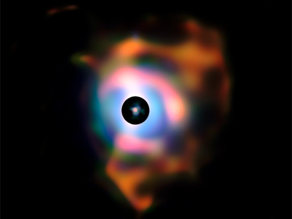 Stars come in different colours and sizes. This new picture shows the famous Red Giant star called Betelgeuse (you say the name as “Beetle-Juice”). The star looks small in the picture – just a little red circle at the centre. But Betelgeuse is actually huge: If you replaced the Sun in our Solar System with this star, it is so wide that it would reach as far as the planet Jupiter!