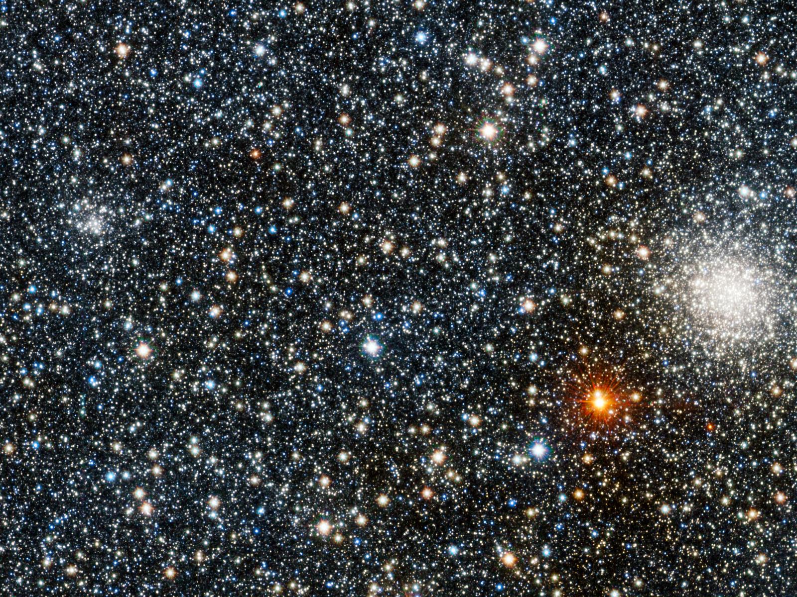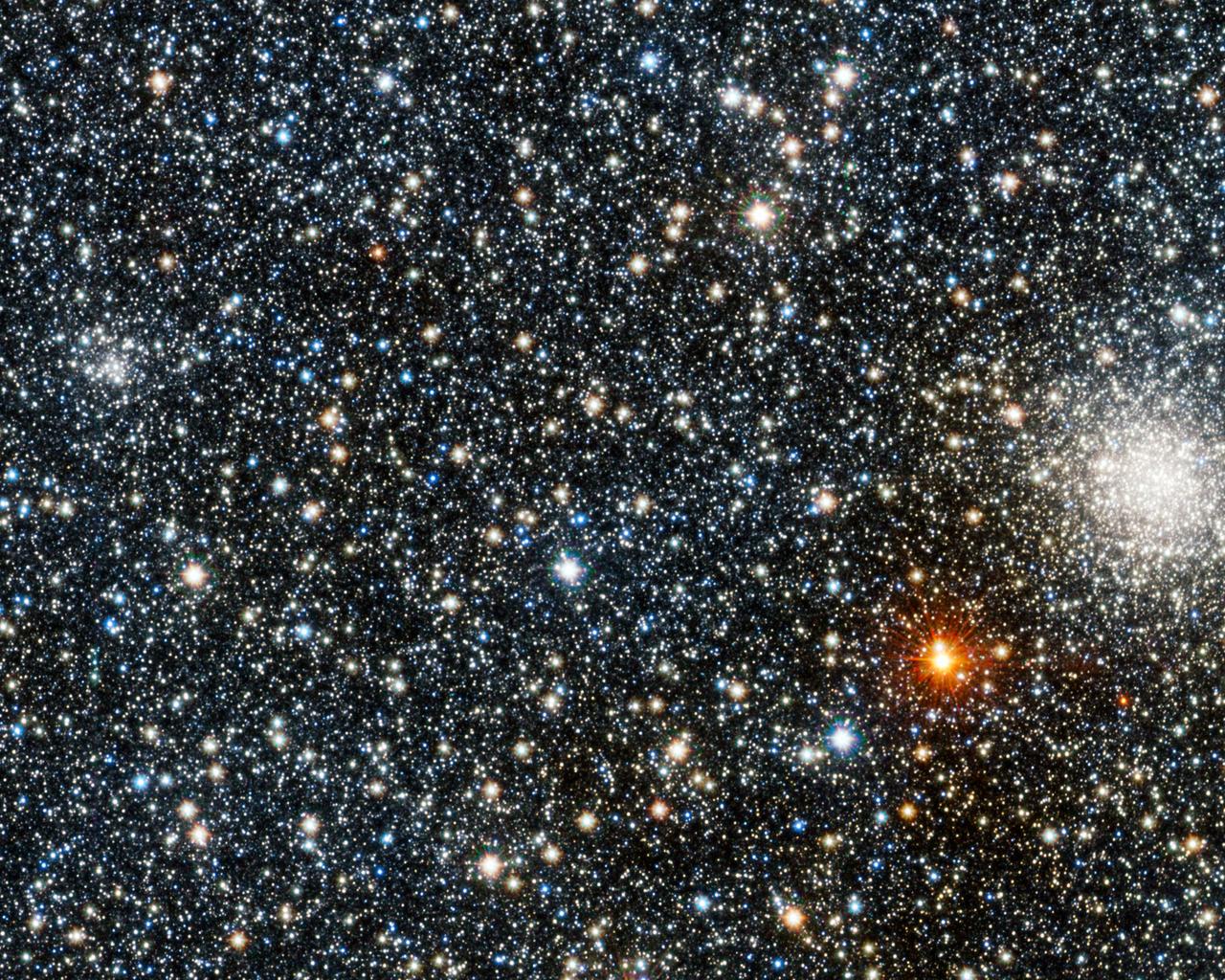 The small centre of the Milky Way is a crowded place, as this is where most of its stars are found. This photo, which was taken by a telescope called VISTA, shows a small part of this busy centre. It is so crowded here that if the Earth moved to this part of our Galaxy, the night sky would be spectacular: stars in the night sky so close that it would be bright enough to read a book without switching on a lamp!