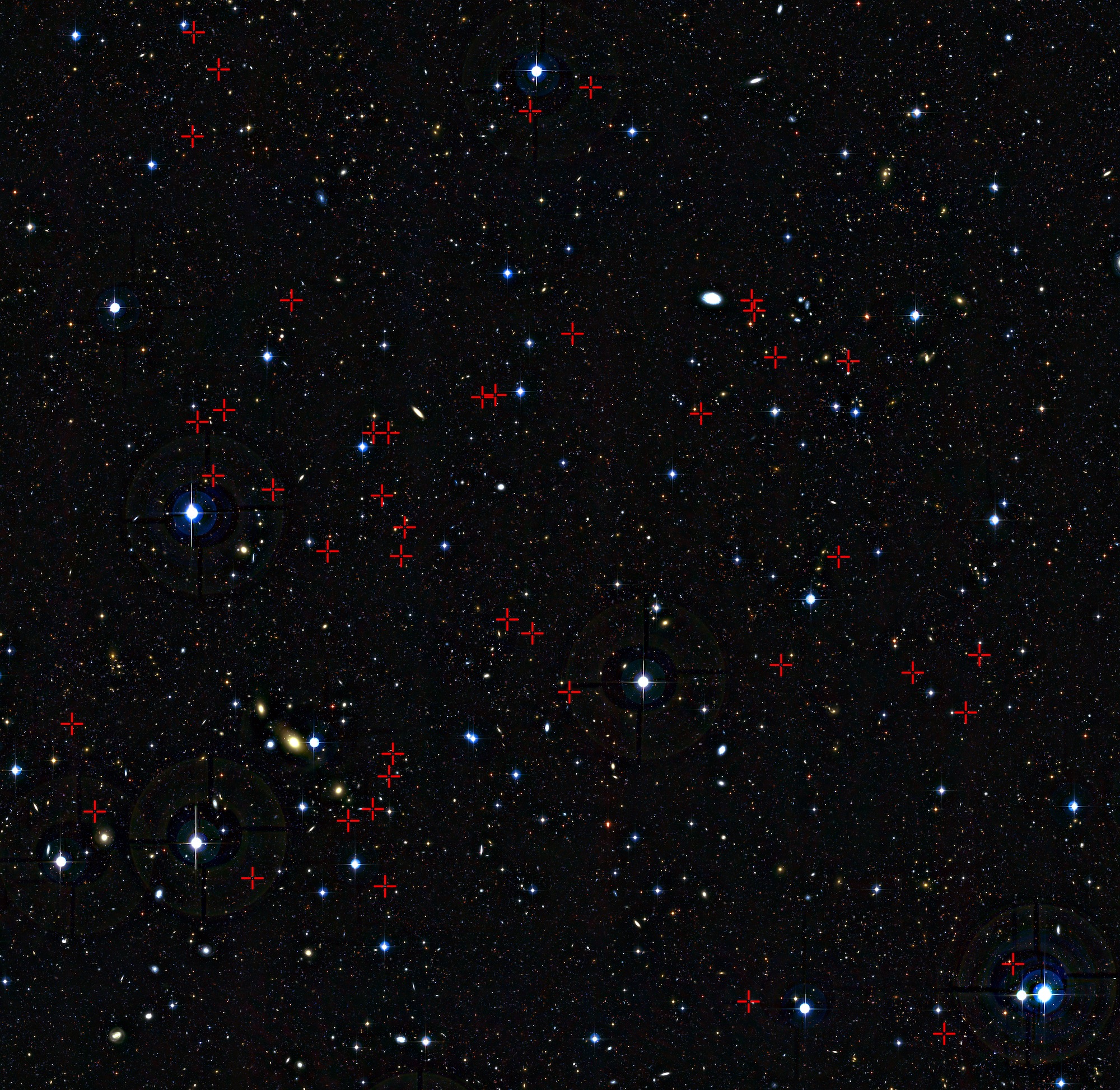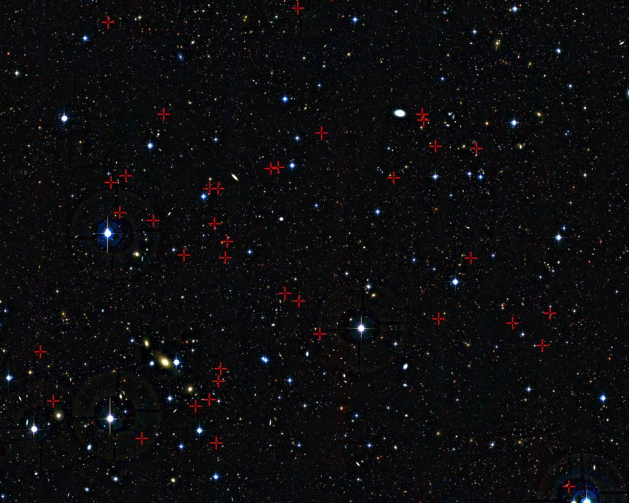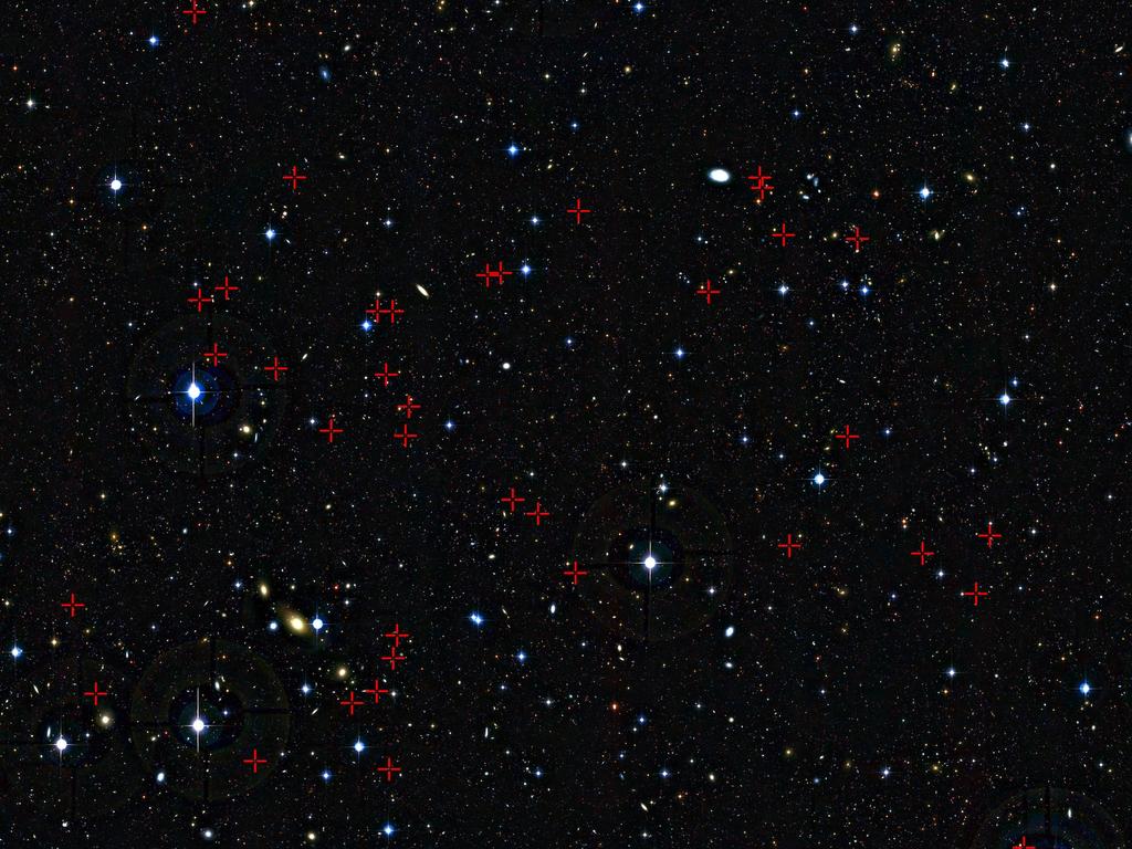 A team of astronomers has used the Very Large Telescope to spy on galaxies at dinnertime. This photo shows some of the galaxies that the astronomers observed marked with red crosses. From their observations, they discovered that galaxies in their early teens like to repeatedly snack on gas. But galaxies in their late teens want a much bigger meal and gobble-up smaller galaxies.
