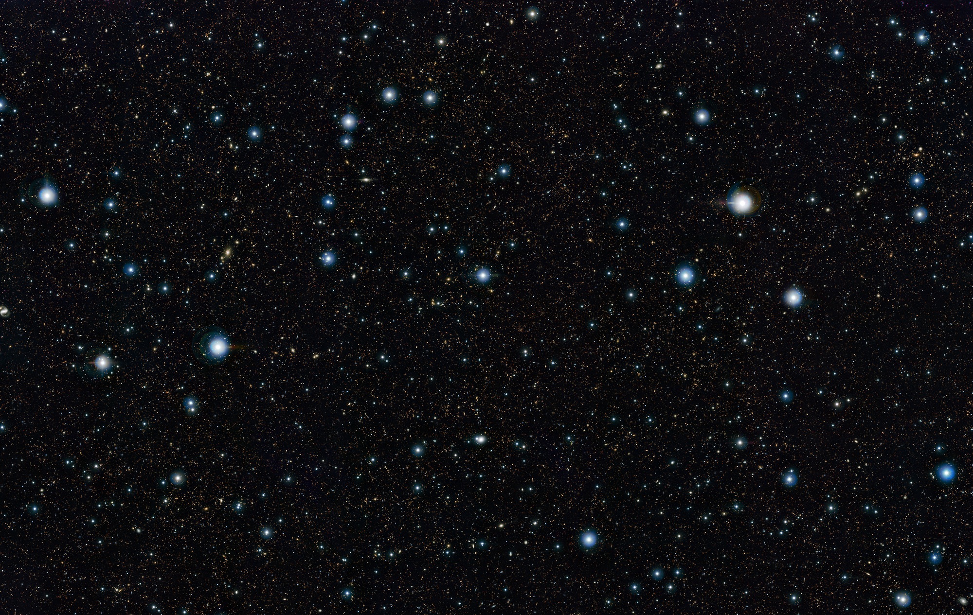 At first glance this new space photo doesn’t look very special, just a few bright stars and a sprinkling of fainter ones. But in fact almost all of those fainter objects are not stars in our Galaxy, the Milky Way. They are actually very remote galaxies, each containing billions of stars!