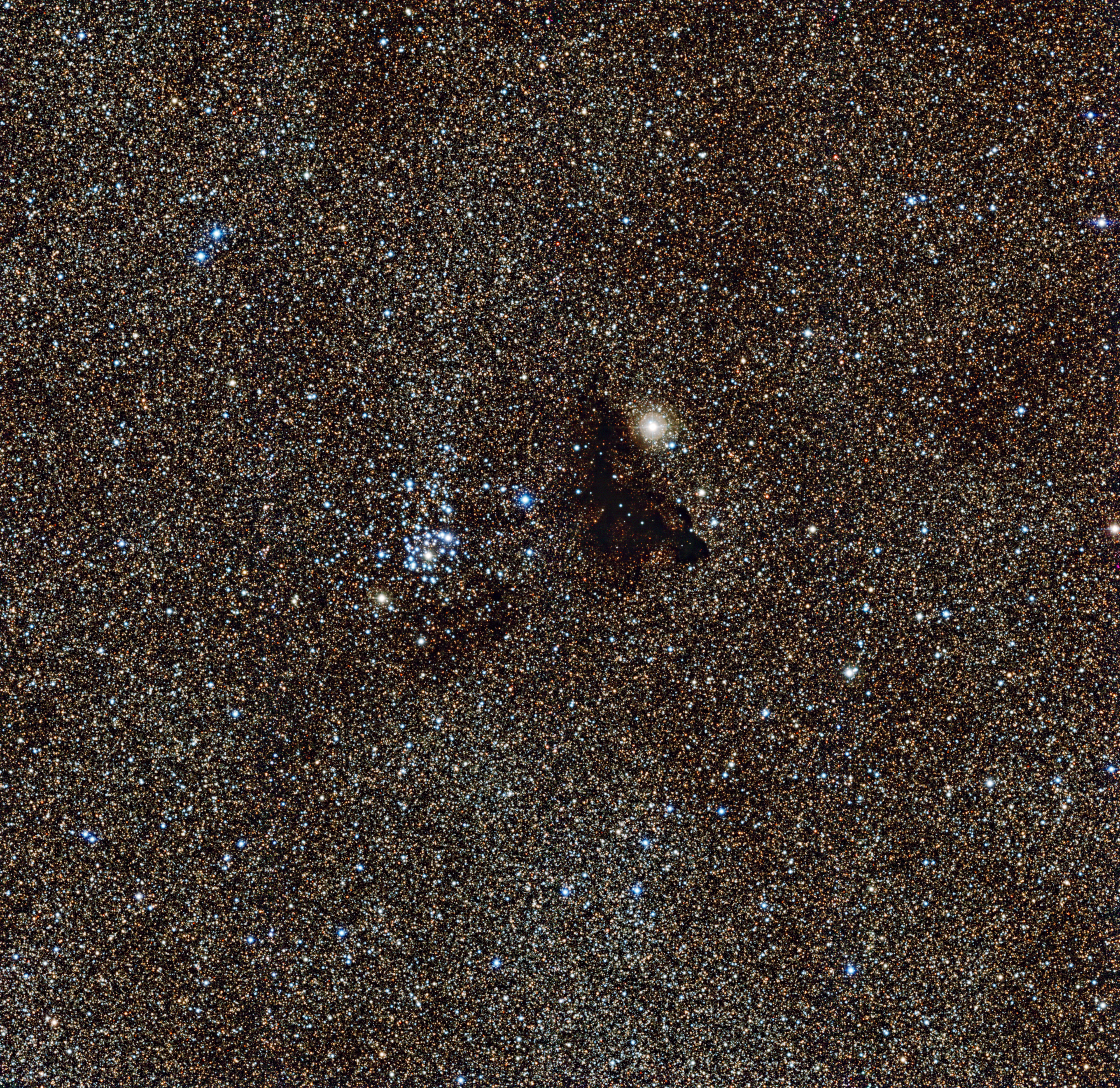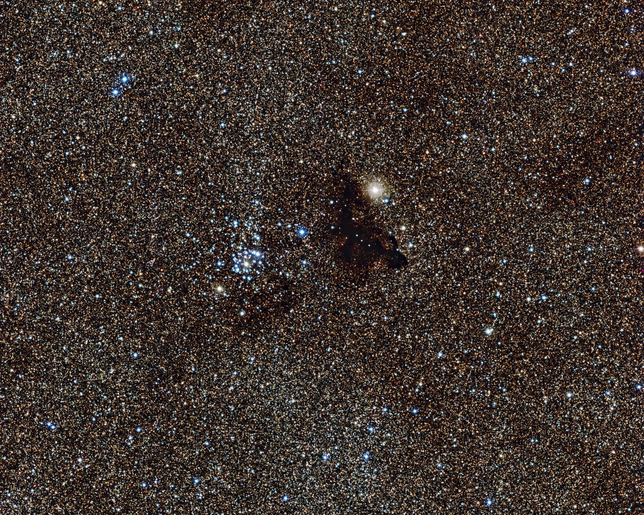 What we're seeing in this picture is millions of glowing stars from the brightest part of our galaxy, the Milky Way. A patch of sky so filled with stars that hardly any dark spots are seen across the entire picture. However in the centre, next to an especially bright, blue star cluster, you can see a strange dark cloud. This might look like an empty hole in the backdrop of stars, but this dark patch is actually a small, isolated cloud of dust sitting in front of the star field. We call clouds like this one ’Bok globules'. It is made up of small dust grains that are blocking the starlight from behind and making the region look empty.