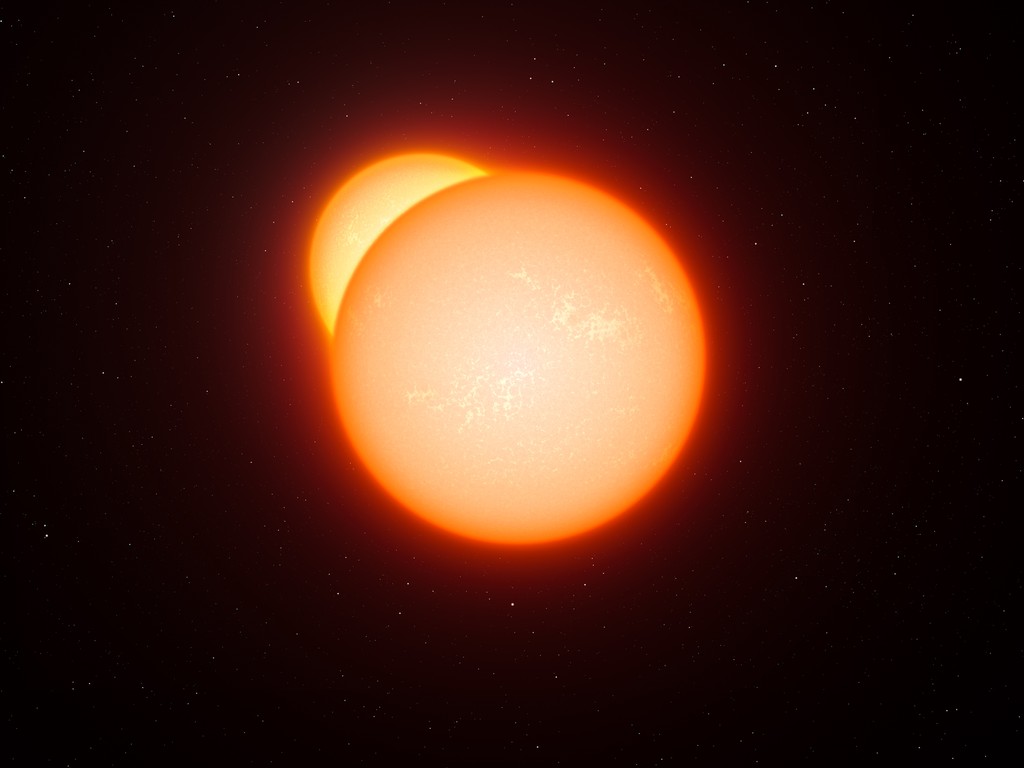 In the case of the Large Magellanic Cloud, its distance was determined by looking at pairs of stars that orbit each other. We call these 'binary systems'; you can see an artist's impression of one in this picture. From Earth, we see the stars regularly passing in front of each other. Each time this happens, the combined brightness of the stars drops. By tracking the changes in brightness very carefully, astronomers can work out all kinds of information: how big the stars are, how much material they have and even how far they are from Earth!