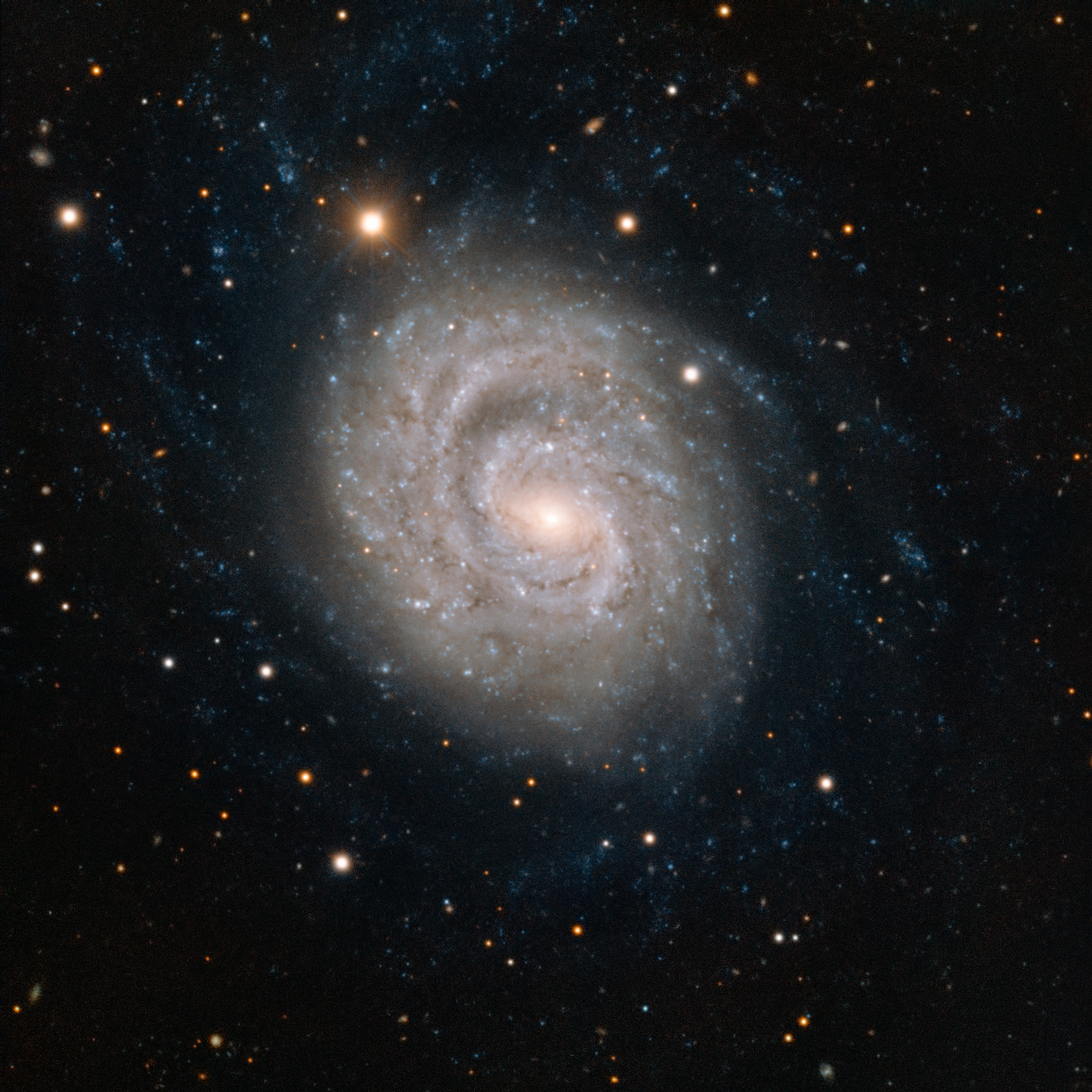 This space picture shows a ‘spiral galaxy’, like the Milky Way. Named so because of the loosely wound spiral-shape arms that can be seen wrapping around the bright galaxy centre. The spiral arms in this picture are highlighted by a bright pattern of blue young stars, glowing gas clouds and dark dust lanes.