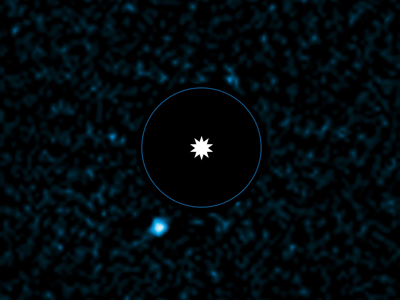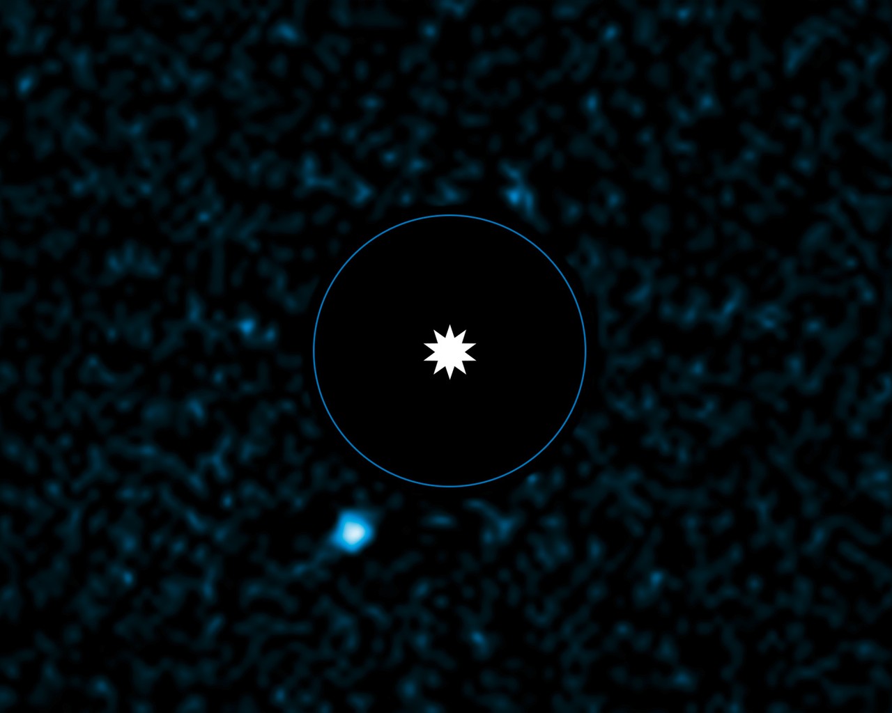 This image shows a newly discovered exoplanet next to its parent star. The star itself has been removed from the picture so that we have a better view of the faint planet better. The blue-coloured exoplanet appears at the lower left of the picture.