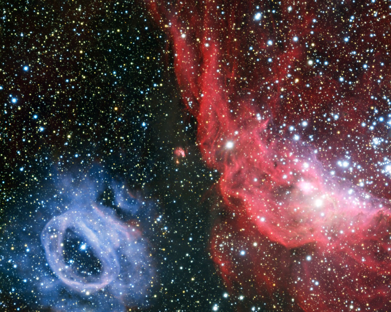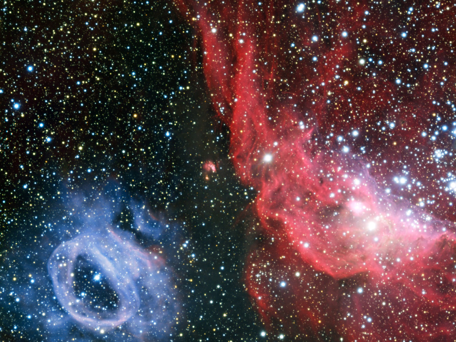 These two clouds could be classed as twins. They can both be found in the same galaxy, the Large Magellanic Cloud. And they're both being lit up by extremely hot young stars inside them. But they look very different because of their chemical make-up. The blue glow tells us that the left cloud is made of oxygen, while the red glow shows us that the other cloud is made of hydrogen.