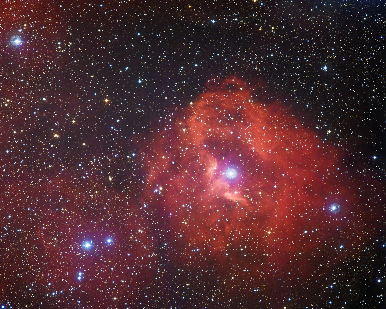 This new space photograph reveals a cosmic cloud called Gum 41, which is made up of hydrogen, the most common gas in the Universe. In the middle of this nebula are lots of brilliant, hot, young stars. The stars are shooting out high-energy light that is causing the surrounding hydrogen to glow this vivid scarlet colour.