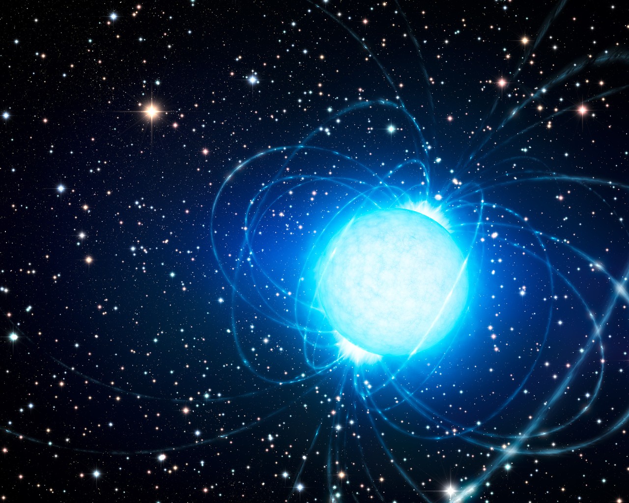 An artist has drawn this picture of a distant magnetar to give us an idea what it would look like close-up. The star is extremely hot and compact, which is why it would glow this bright blue-white colour. You wouldn't actually see the funky arcs coming out of the star, these are supposed to emphasise the star's ultra-strong magnetic field. However, in reality, magnetic fields are invisible.