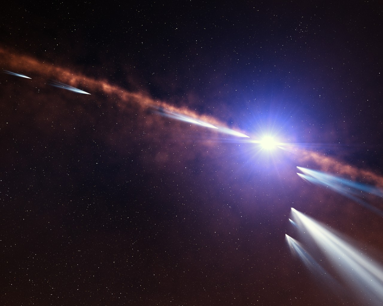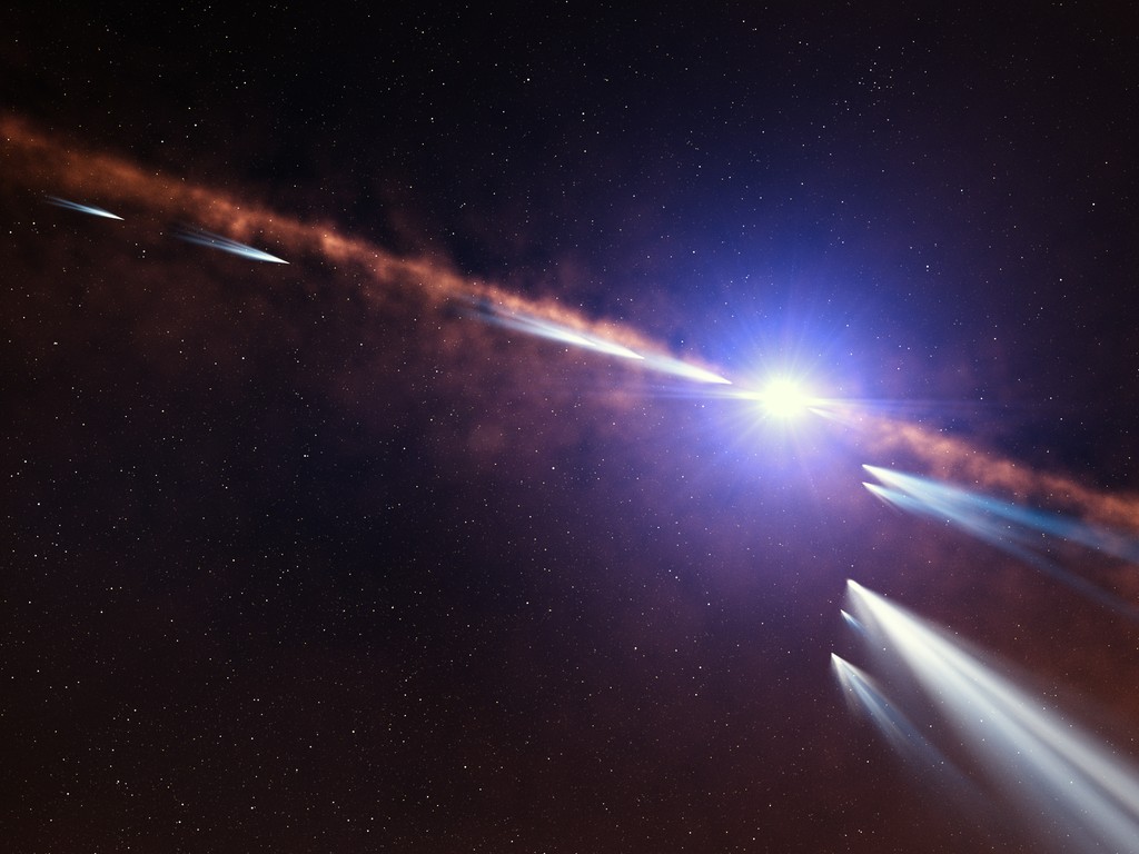 Astronomers recently discovered that a nearby star is being orbited by at least 500 comets! This picture was created by an artist to illustrate the environment around the star and give us an idea what the scene would look like up close.