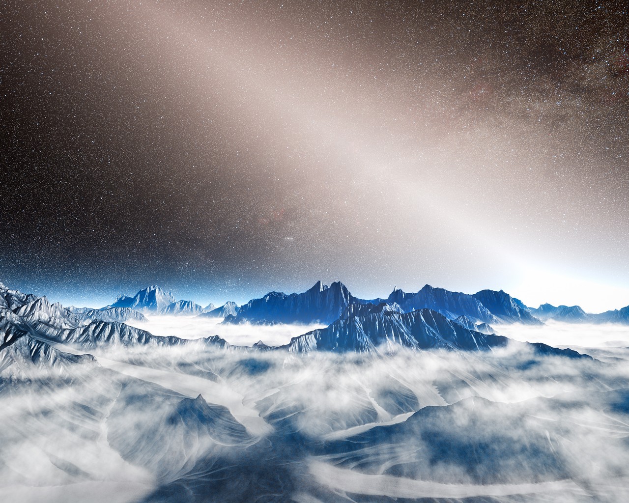This picture was created by an artist to show the eerie glow we call ‘false dawn’ or ‘zodiacal light’. It’s caused by sunlight reflecting off dark cosmic dust in our Solar System and others.