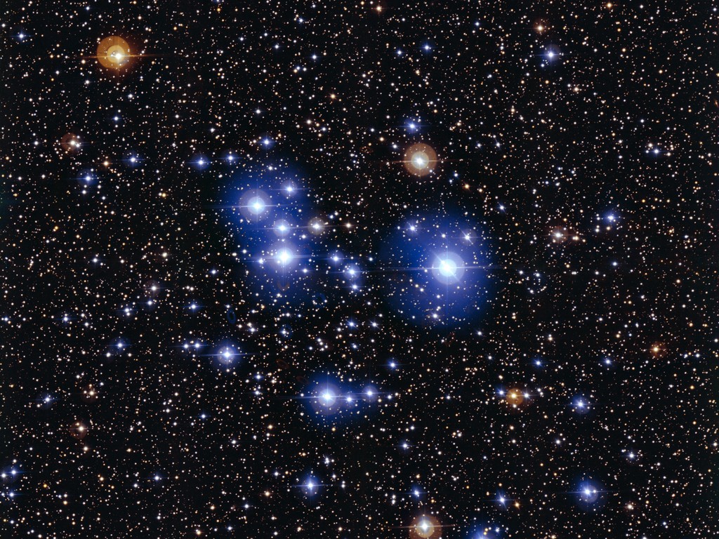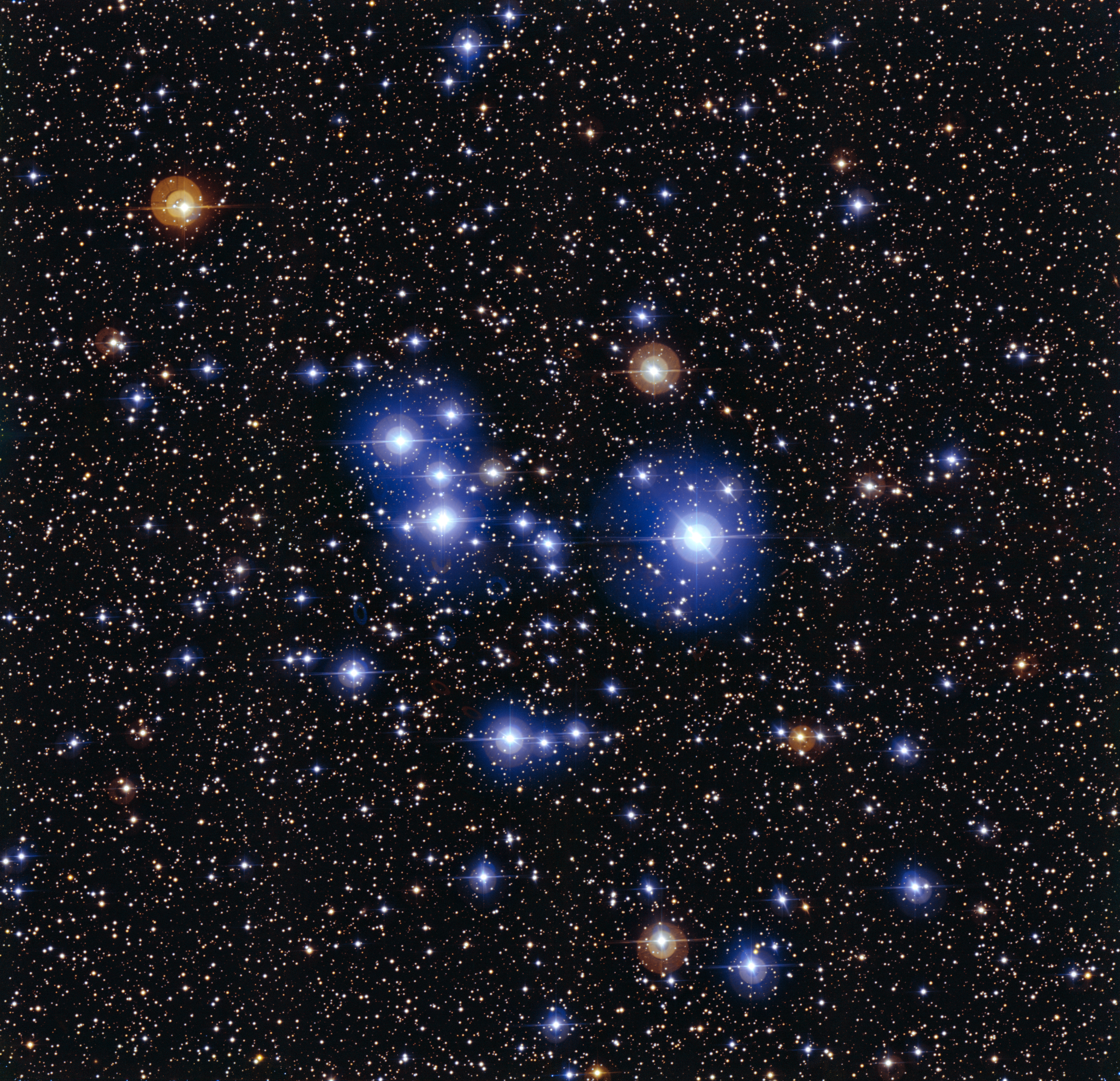 This spectacular image is of the star cluster named Messier 47. The cluster is dominated by a sprinkling of around brilliant young blue stars with a few striking red giant stars.