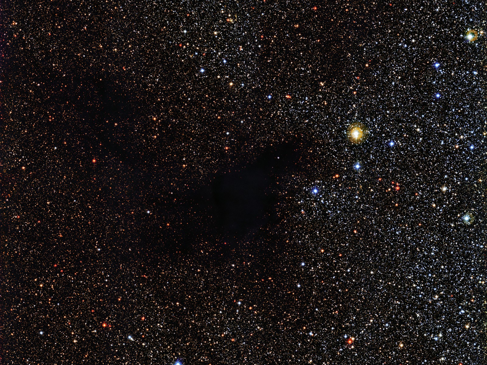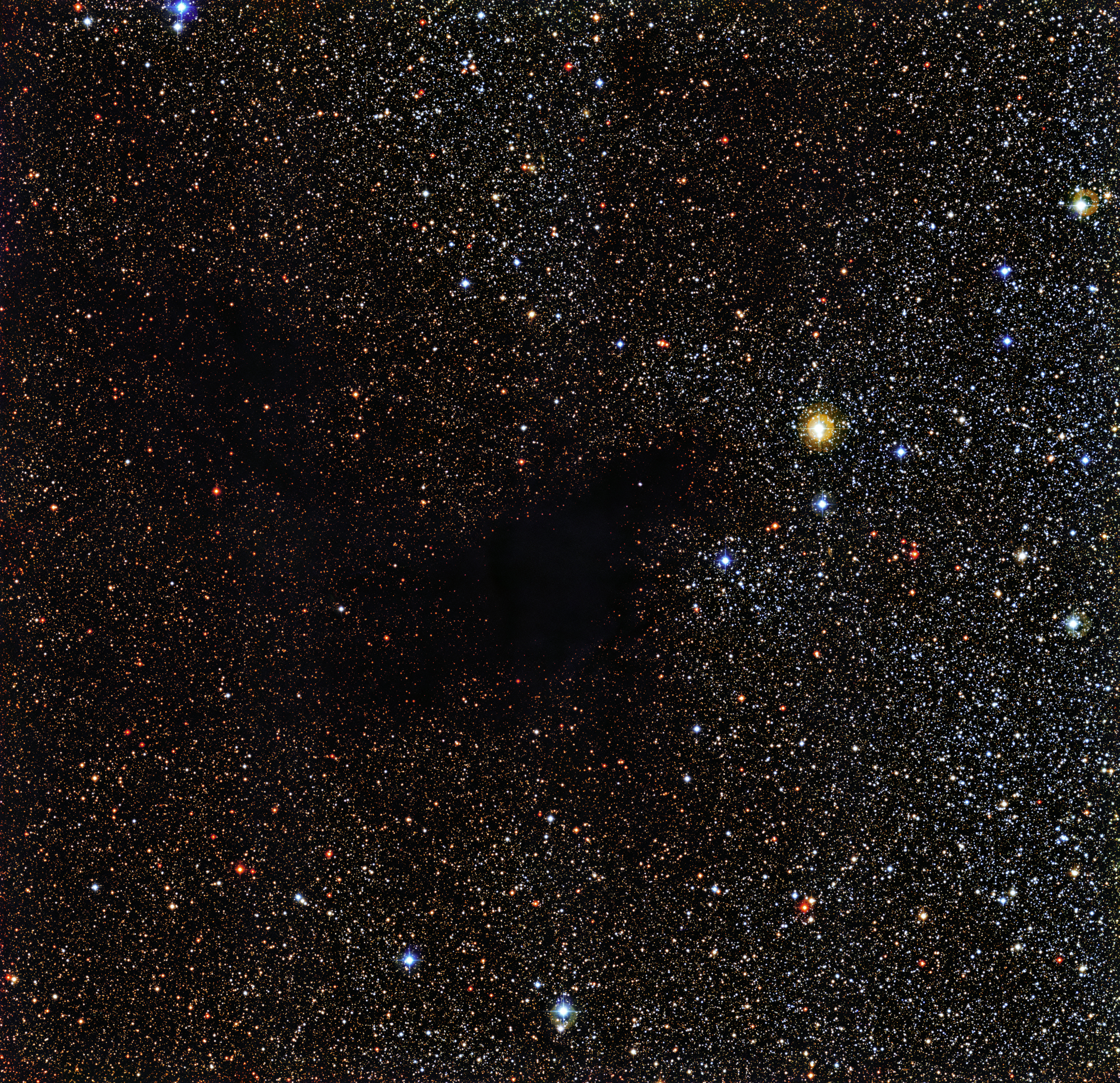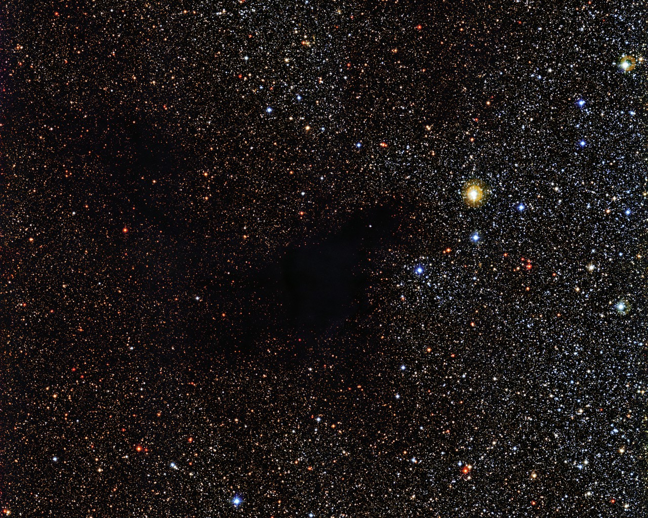 It looks like someone has stolen the stars right out of the sky in this new photograph of space! But don’t worry, the black gap in this glittering starfield isn’t really a gap at all. It is a dark cloud of gas and dust called a Dark Nebulae that is blocking the light of any background stars.