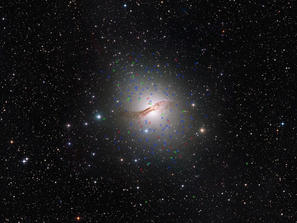 This space photograph shows galaxy called Centaurus A (sen-TOR-us Ay). The galaxy is surrounded by thousands of globular clusters. Each of the circles in this picture shows the location of a cluster. Many of them are normal, but some of them have a dark secret — they hold lots of dark matter!
