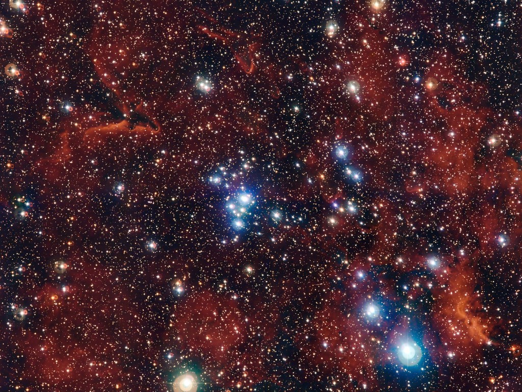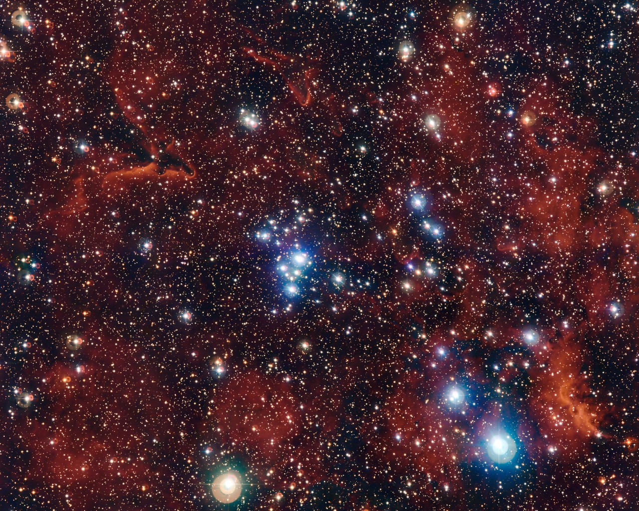 This picture, taken by the Very Large Telescope, shows a group of young stars called an Open Cluster. Unlike some other groups of stars, the stars in open clusters slowly drift apart as they get older, over a few hundred million years. Actually, our own Sun was probably born in an open cluster with hundreds of siblings that have long since wandered off into space!