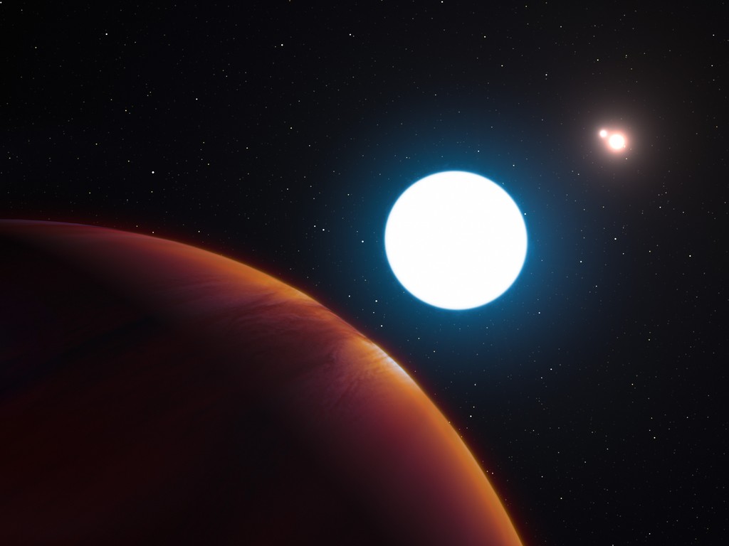 This picture was drawn by an artist to show the very distant planet HD 131399ab. This newly discovered planet orbits a star in a triple star system, meaning there are sometimes three stars in its sky at once!