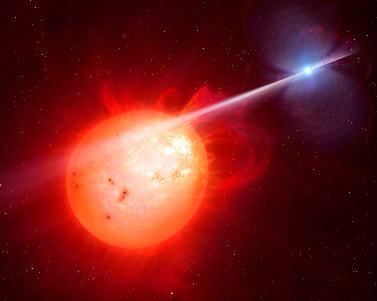 This artist’s impression of a white dwarf releasing blasts of radiation that lash its companion red dwarf star.