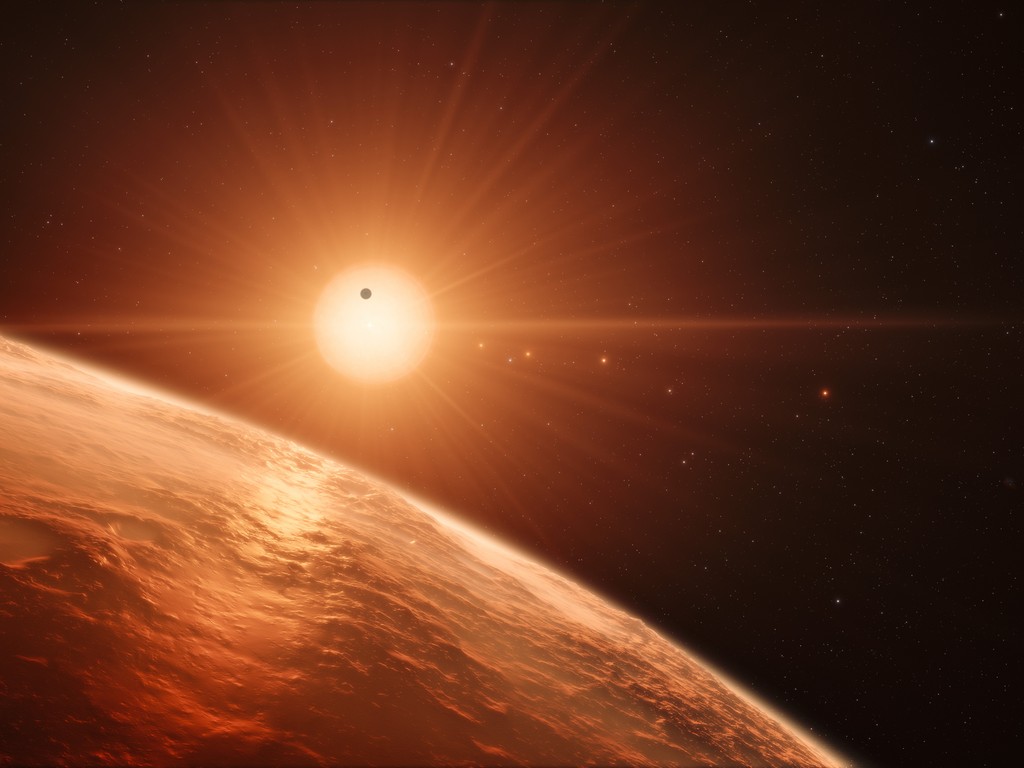 This picture was created by an artists to show the view from the surface of one of the planets in a newly discovered solar system that is home to seven small, rocky planets. The new system is a record-breaker on two accounts: it has the most Earth-sized planets, and the most potentially life-bearing worlds!