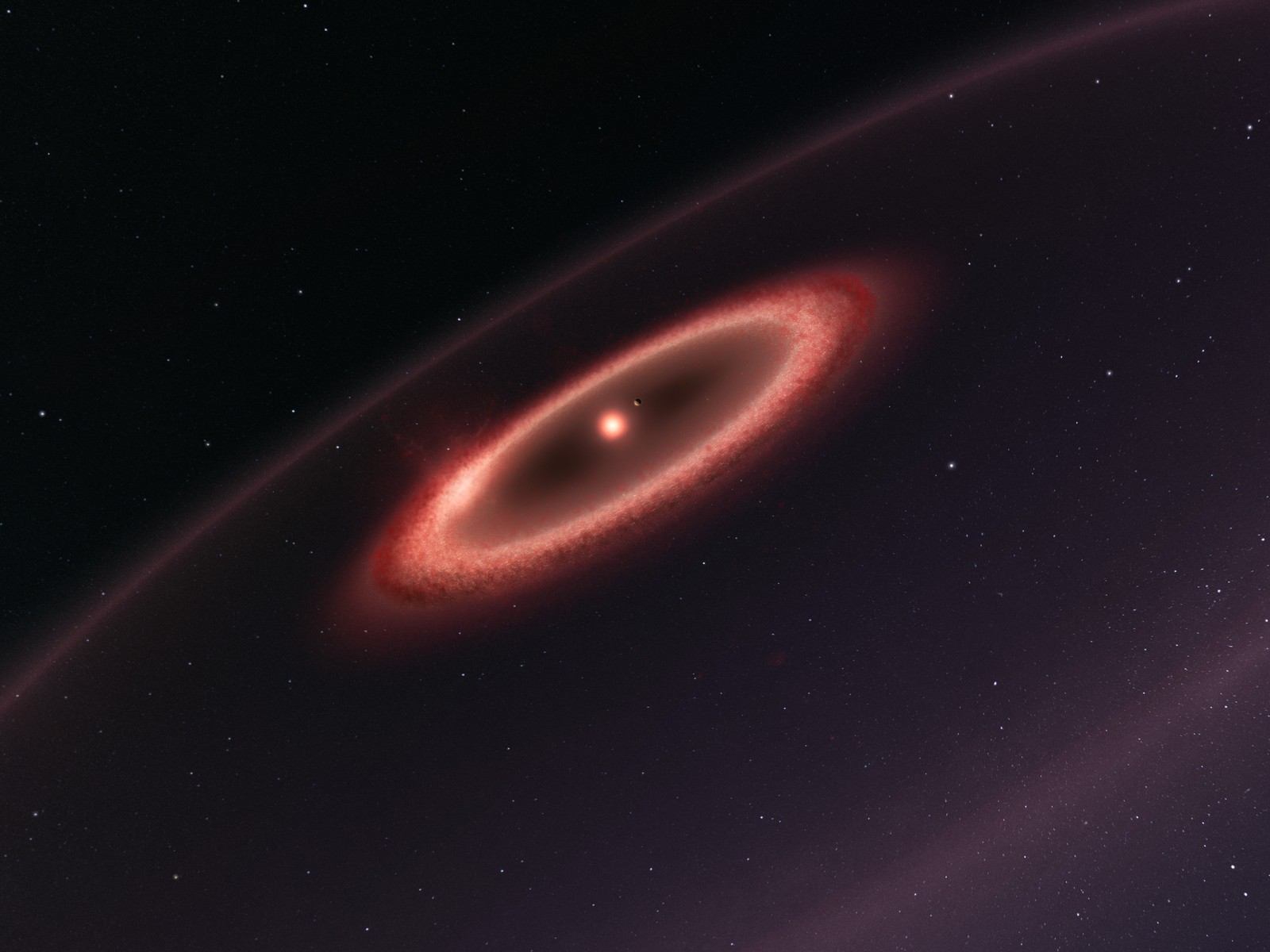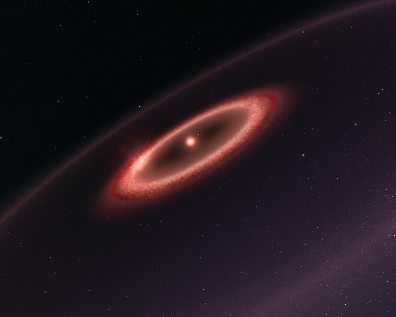 This picture was created by an artist to show us what the belts of dust around the closest star to the Solar System look like. This sketch is not to scale — in reality, the central star would be much smaller and the dust belts further out.
